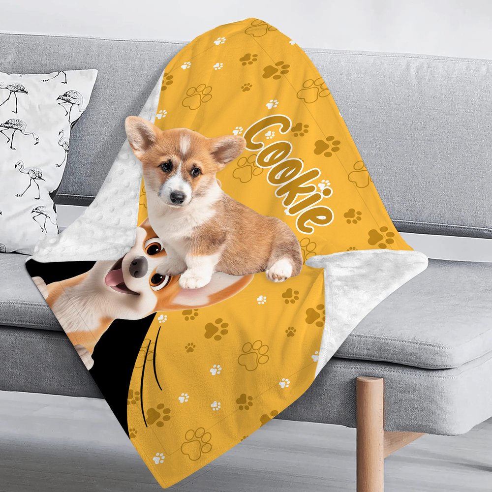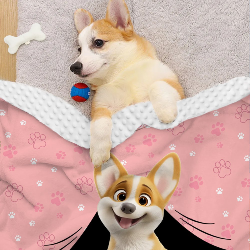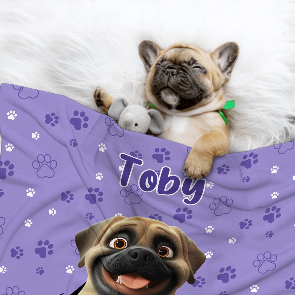 Our pet blanket features a cute and realistic 3D cartoon dog design that captures your pet's lively personality and spirit. You can choose your pet's breed and add their name, and the background can be decorated with bows or paw prints for a fun touch.