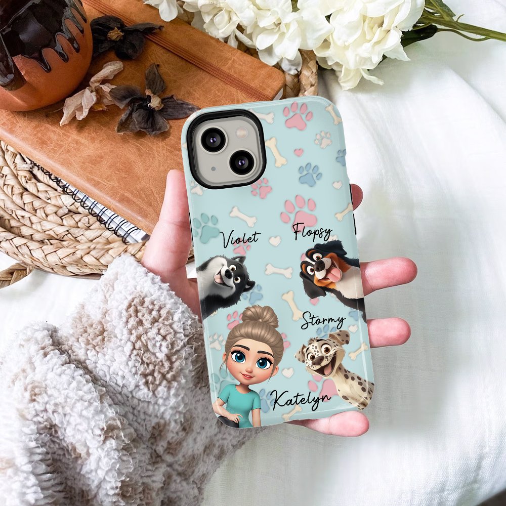 This phone case features a unique 3D cartoon design that shows the warm relationship between a girl and her dog. The front of the phone case is printed with a cute girl and 1-4 dogs. You can customize your name and your pet's name to make it a unique and exclusive commemoration.