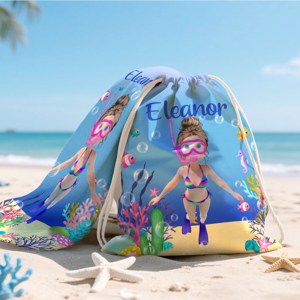 This beach towel features cute children's diving images and a variety of marine animals, including dolphins, turtles, and clownfish. The background is also adorned with rich marine elements, such as corals and seaweed, creating a dreamy underwater world. The Personalised name customization function makes each beach towel unique, which is very suitable for showing the personality of children.