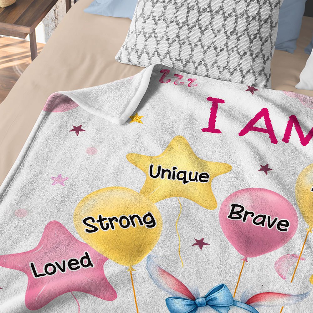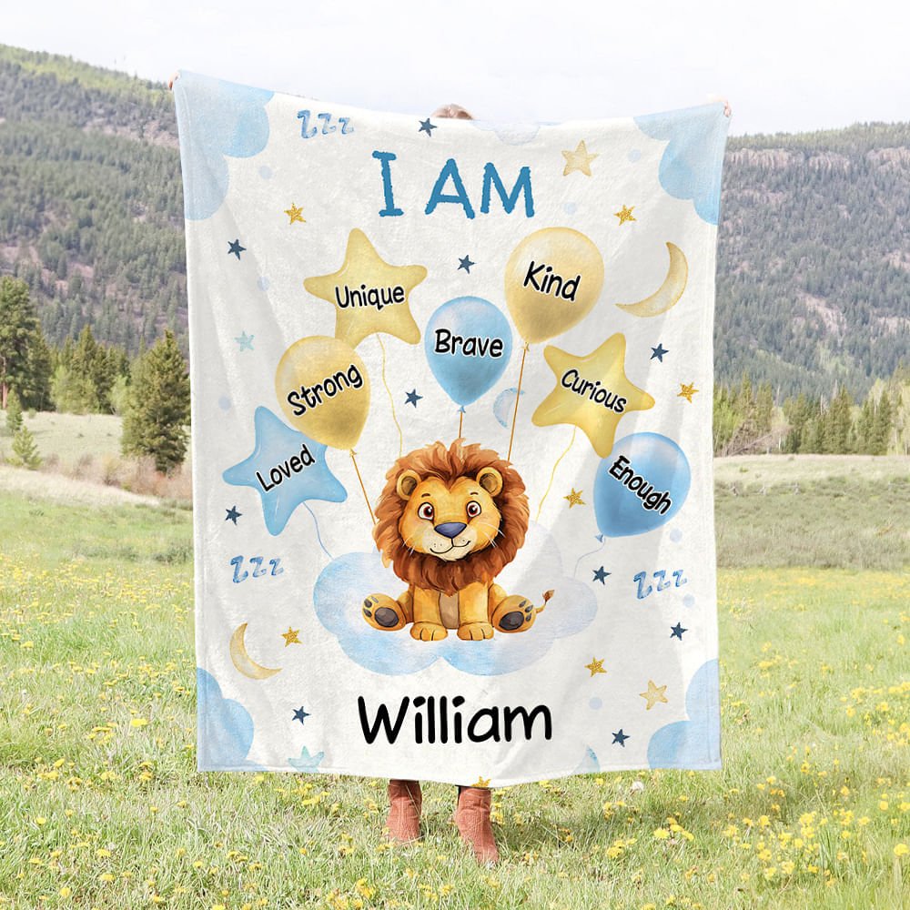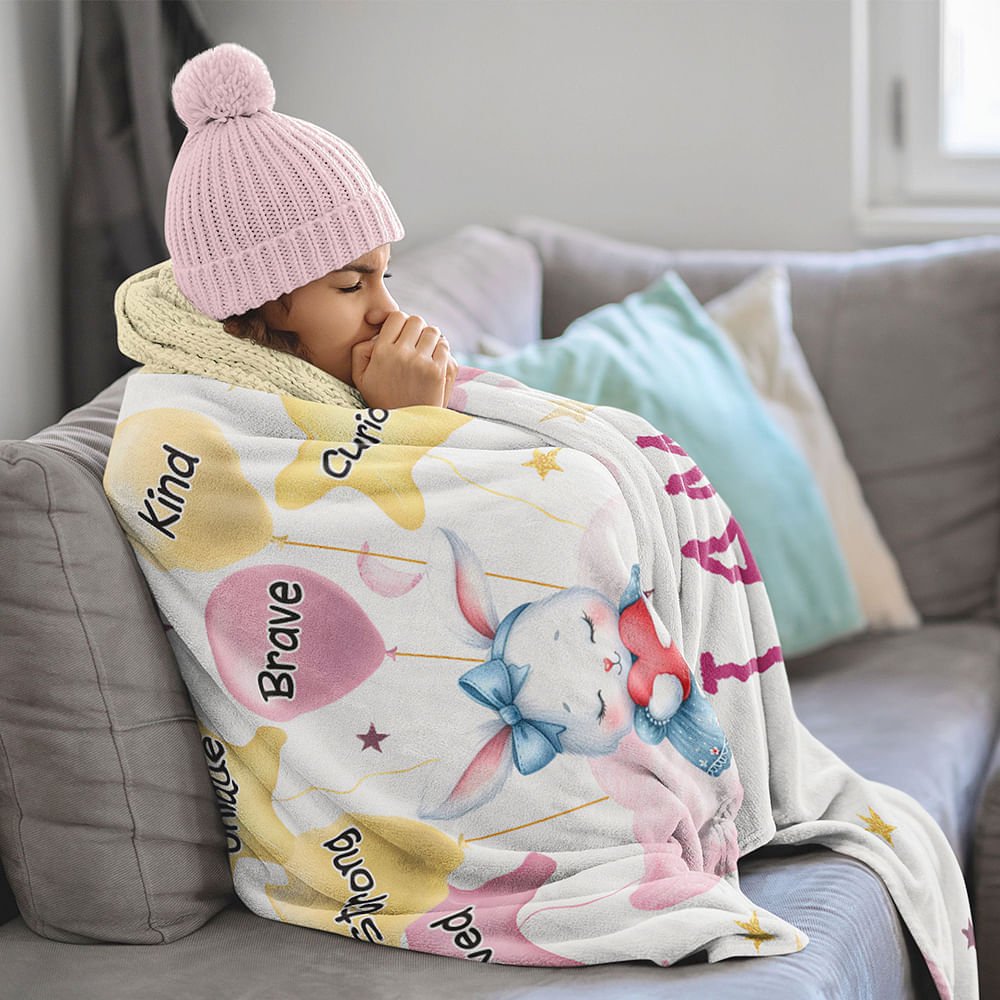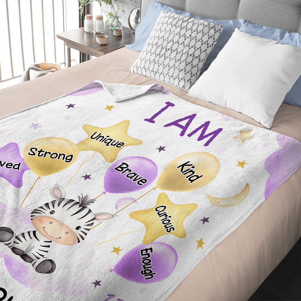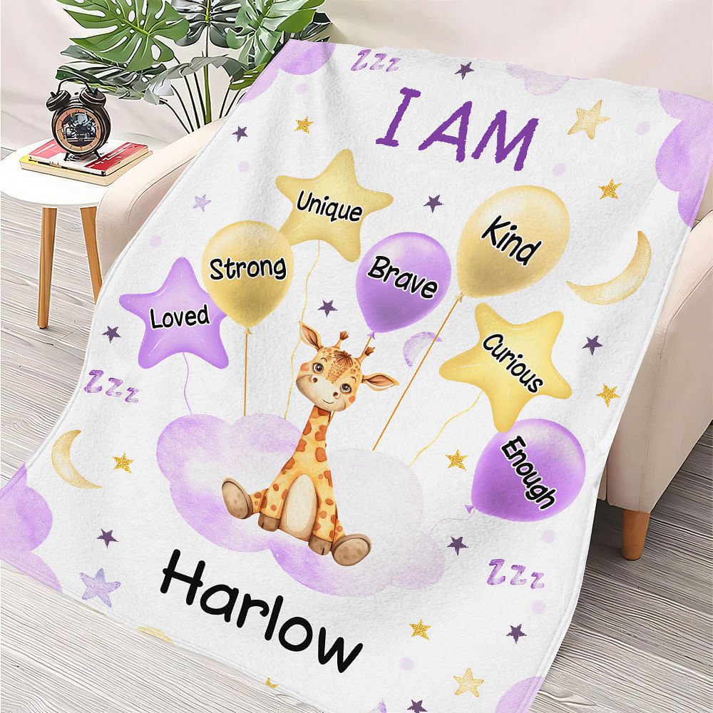 This blanket features charming watercolor illustrations of animals, balloons, stars, and moons, creating a whimsical and delightful aesthetic. Personalised with the child’s name and encouraging words such as “Brave,” “Kind,” and “Unique,” it’s designed to fill your child’s space with love and positivity.