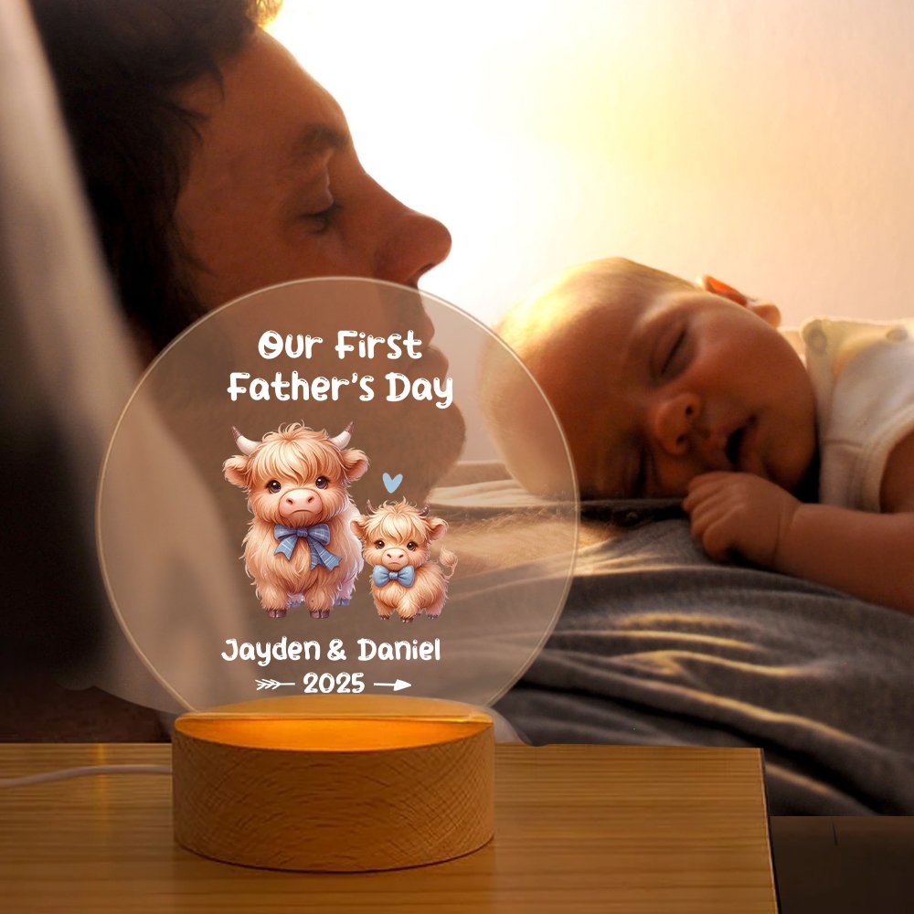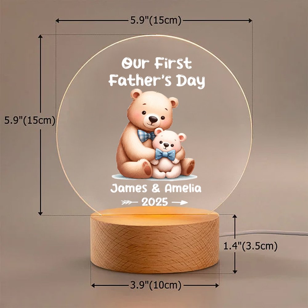This night light features adorable cartoon designs of father-and-baby animal pairs, including elephants, giraffes, dinosaurs, and more. The eye-catching title ”Our First Father’s Day” is full of childlike fun and warmth. It can also customize a father’s name, baby’s name, and year, making it more unique.