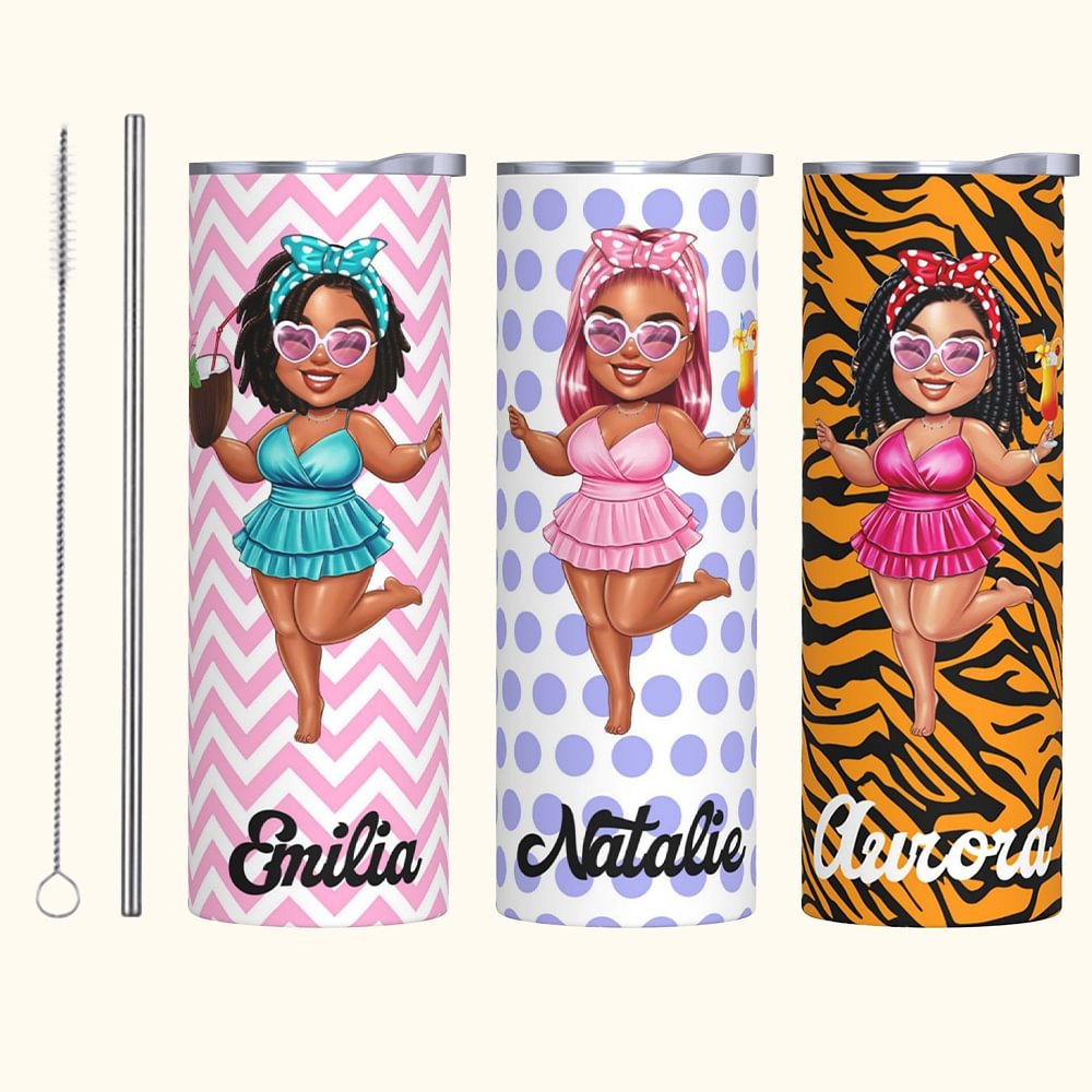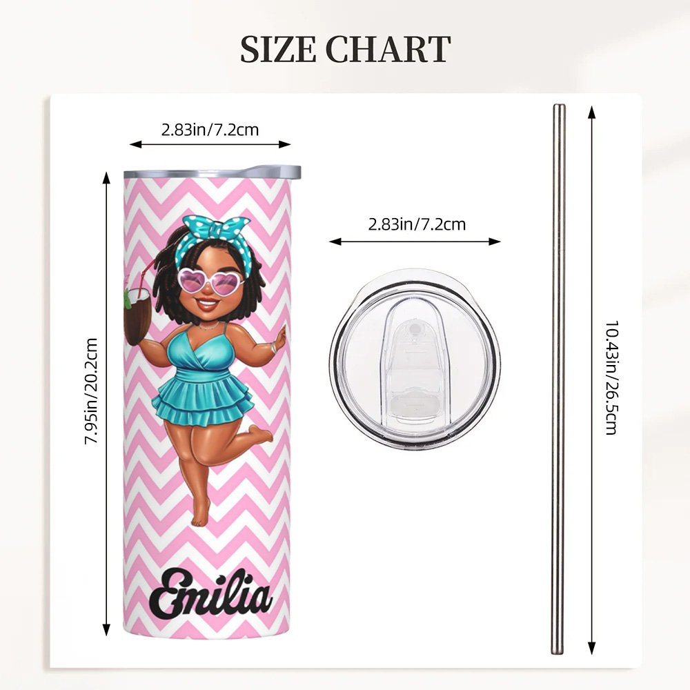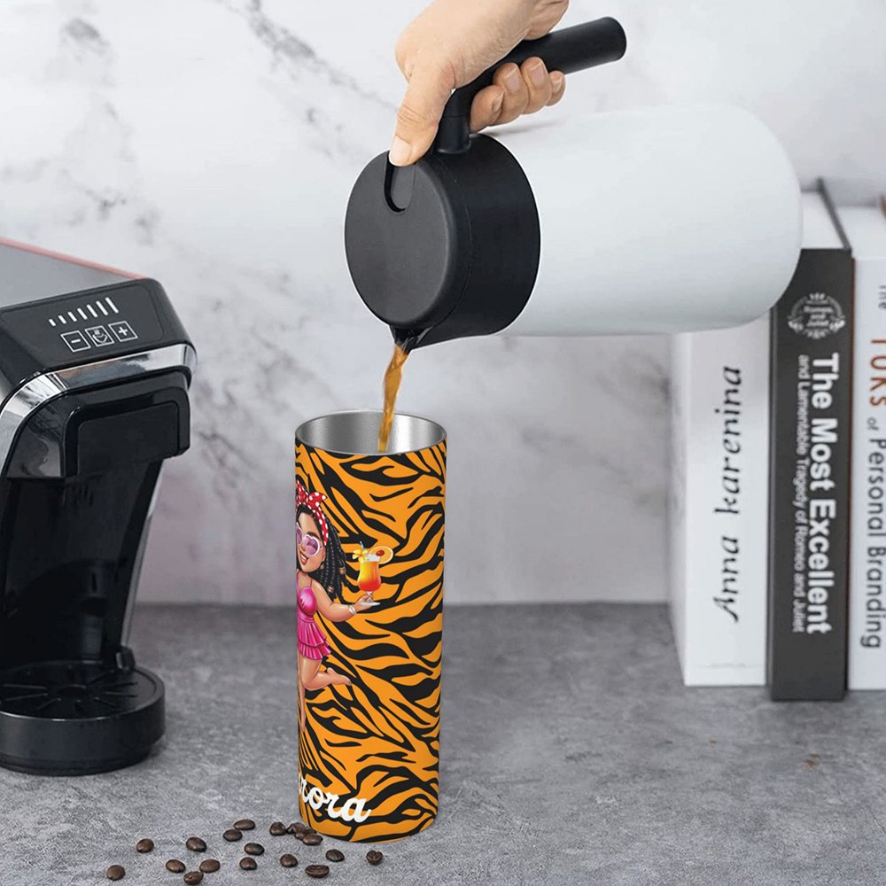 This delightful tumbler features an adorable cartoon Black woman. You can Personalise it with a name and vibrant backgrounds like glitter, leopard print, tiger stripes, and polka dots, allowing for a truly one-of-a-kind accessory that reflects individual style.