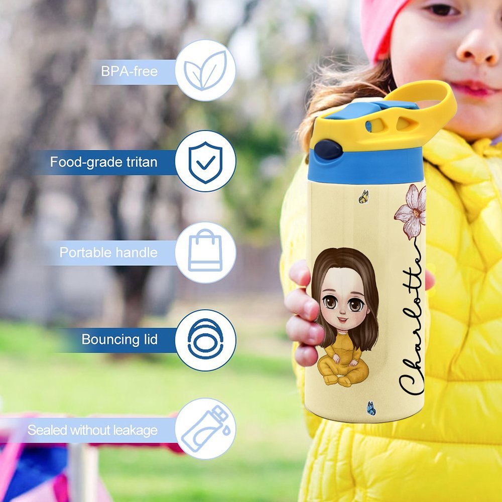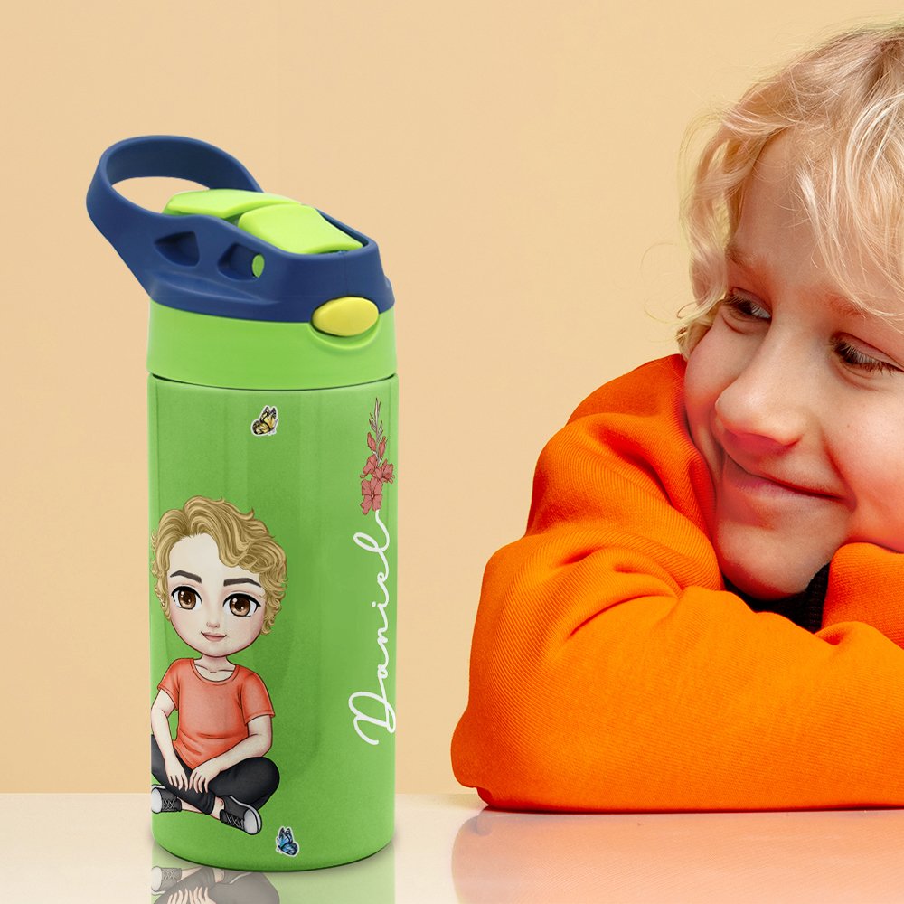 This water bottle features a Personalised cute cartoon character design, allowing kids to express their unique personalities and styles. It is also paired with a birthday flower and name so every child can find their own flower and showcase their individual charm.