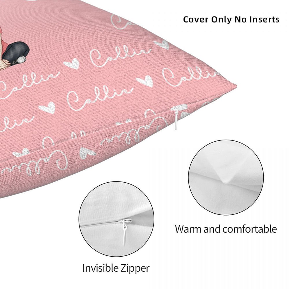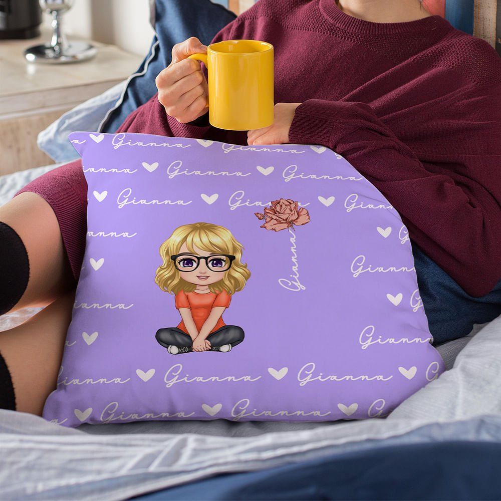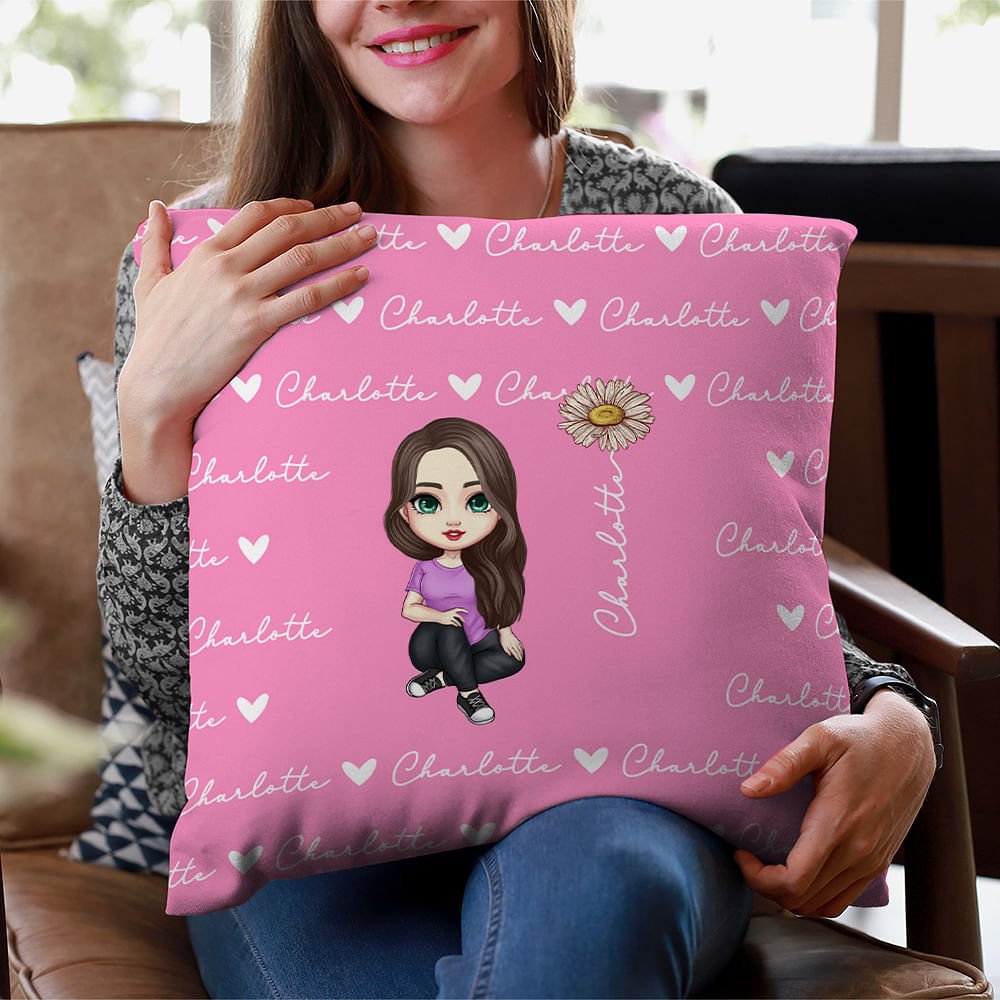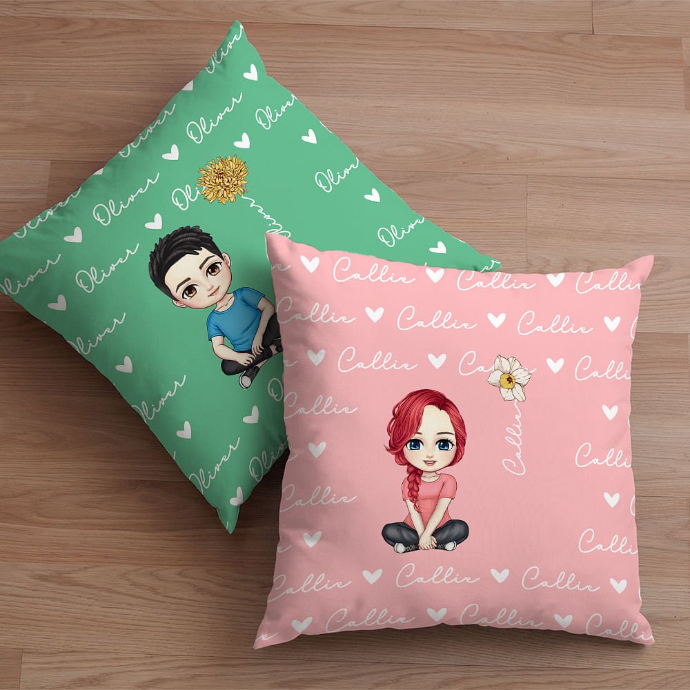 This throw pillow cover features adorable cartoon characters and heart icons, birth flower illustrations that can be Personalised with a name, and is appealing to girls, boys, and adults alike.
