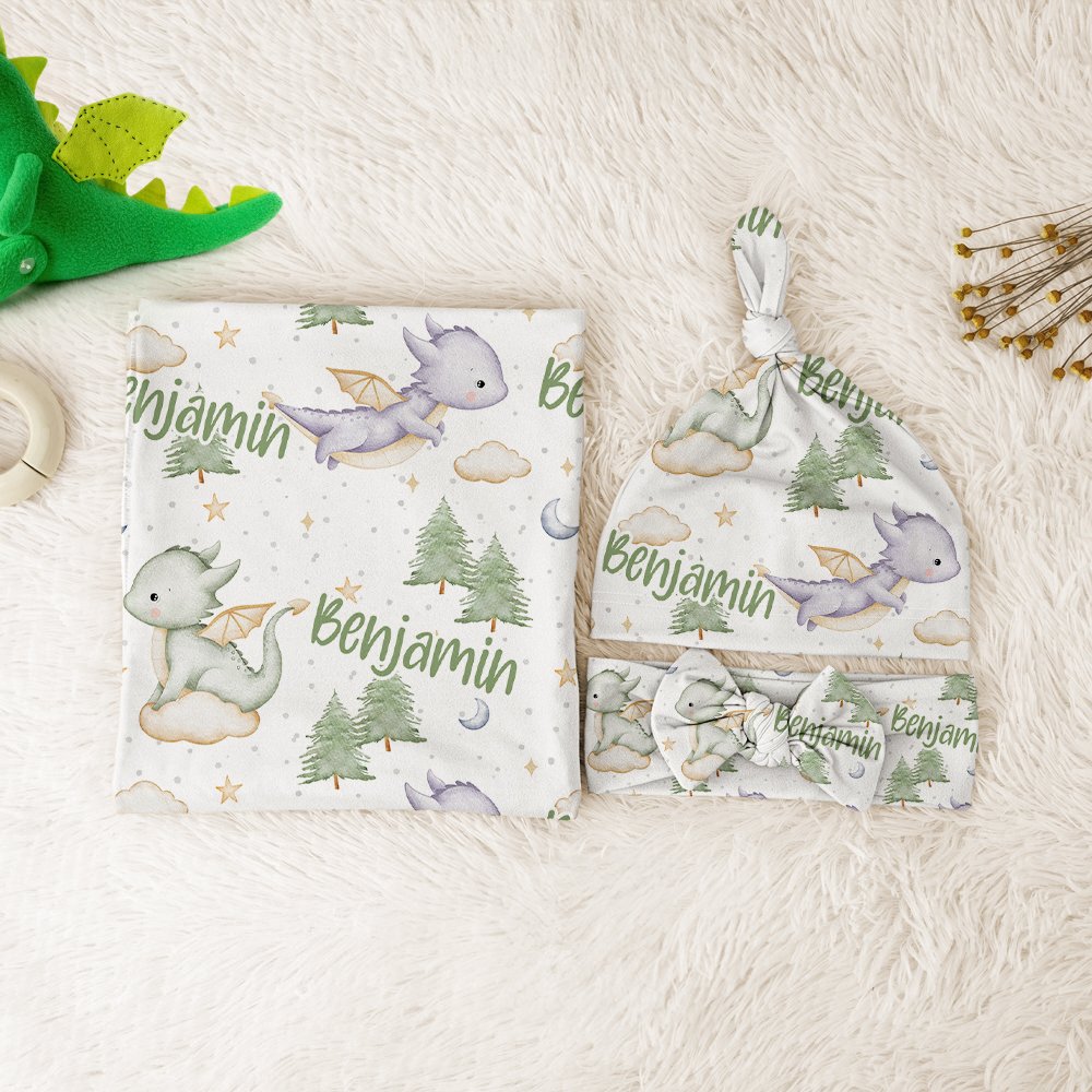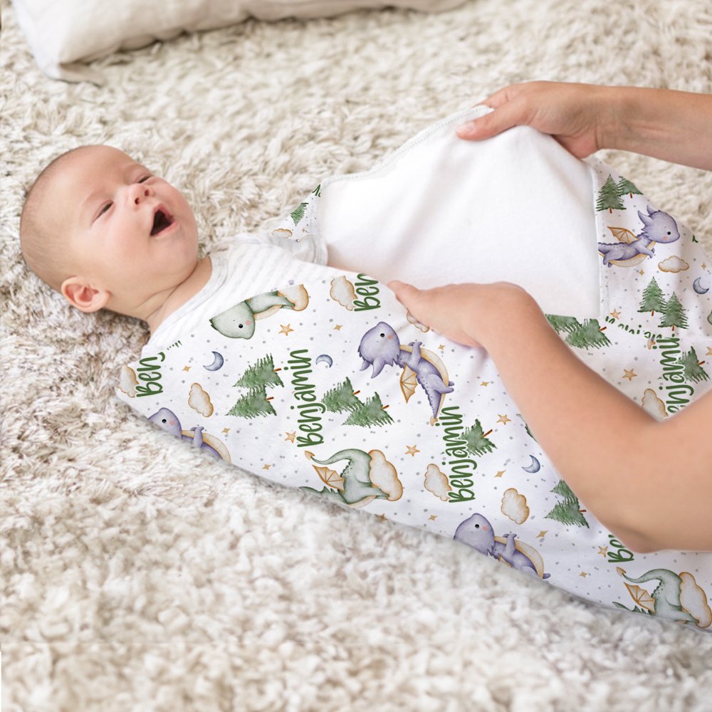 The design theme of our swaddle blanket is the dinosaur forest theme, with cute purple and green dinosaurs and pine forest elements in the picture, warm and healing. You can customize your baby's name to add a Personalised touch, making this gift a precious souvenir.