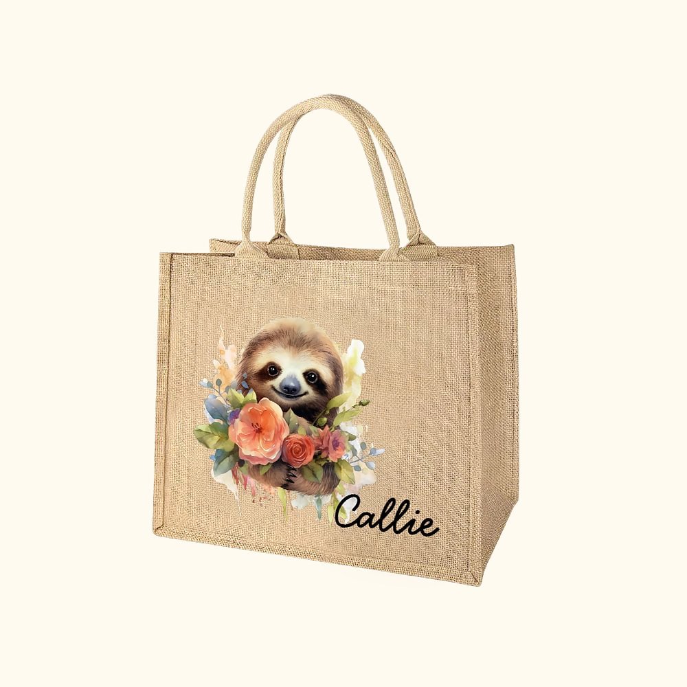 This tote bag incorporates the design of cartoon sloths and flowers. It has 16 different patterns, capturing the different movements and expressions of sloths, presenting a variety of styles such as cute, playful, elegant, childlike, and warm. Your name can be shown on the front, which is a way to express your personality.
