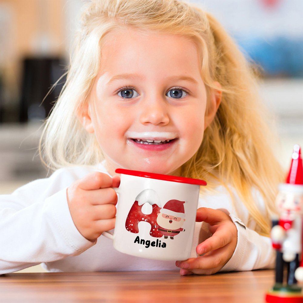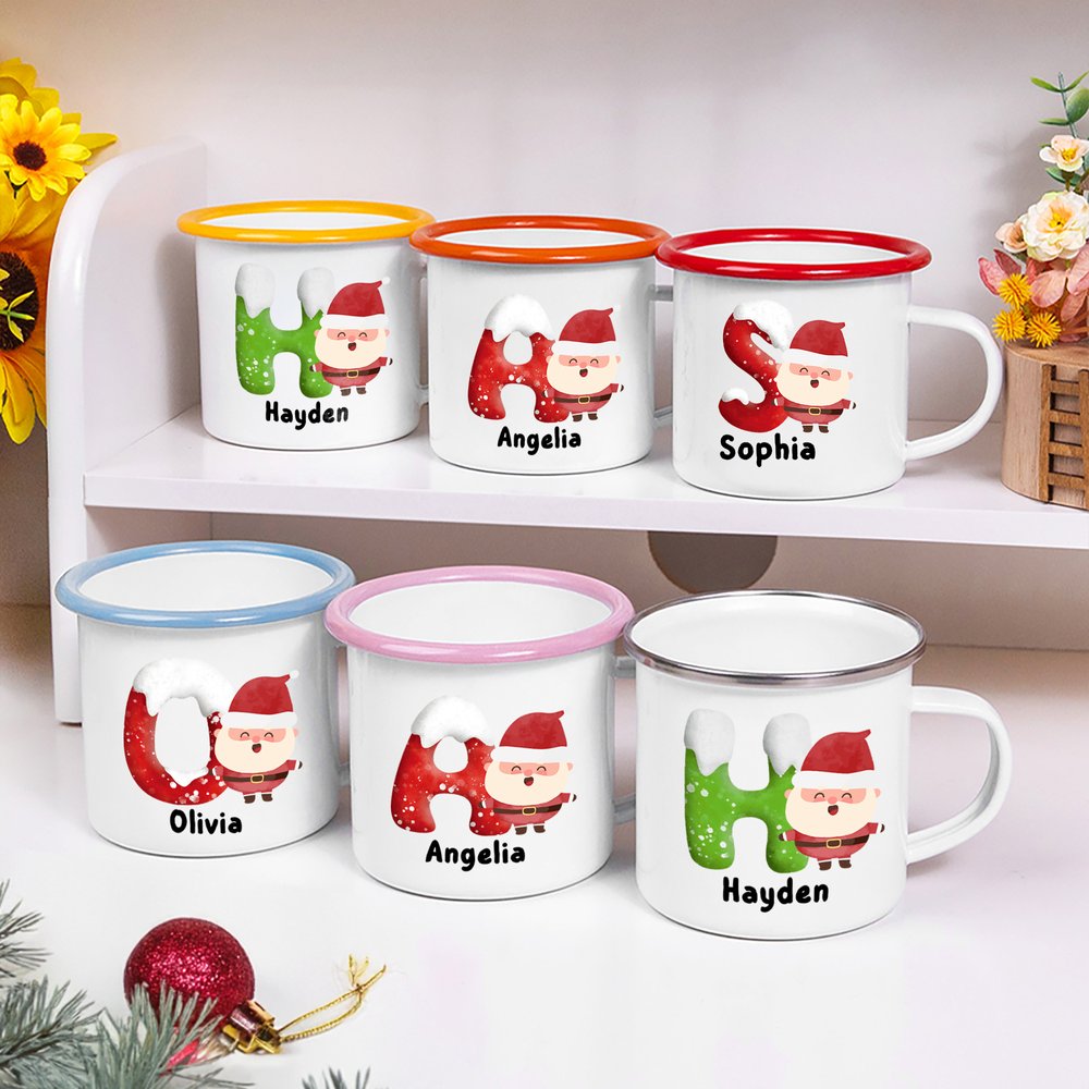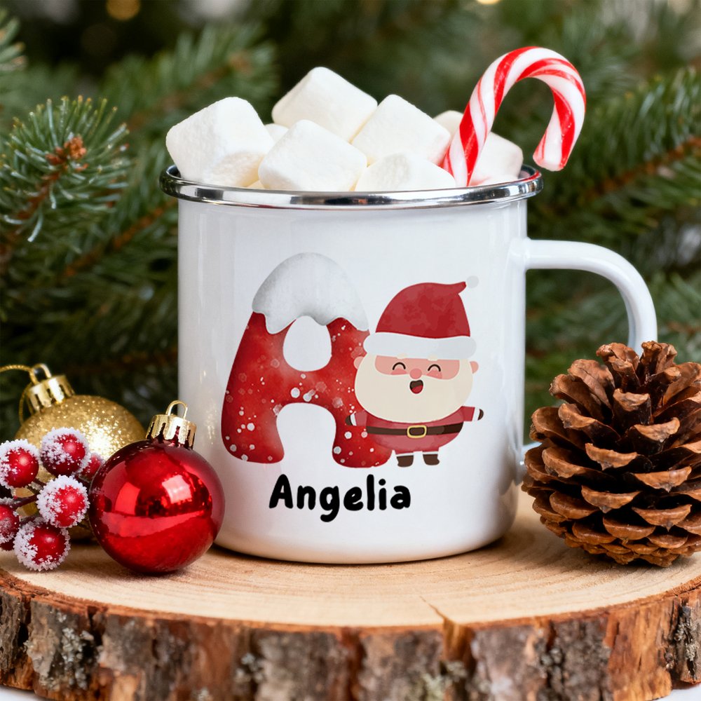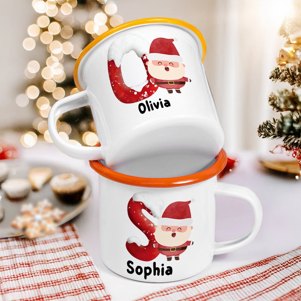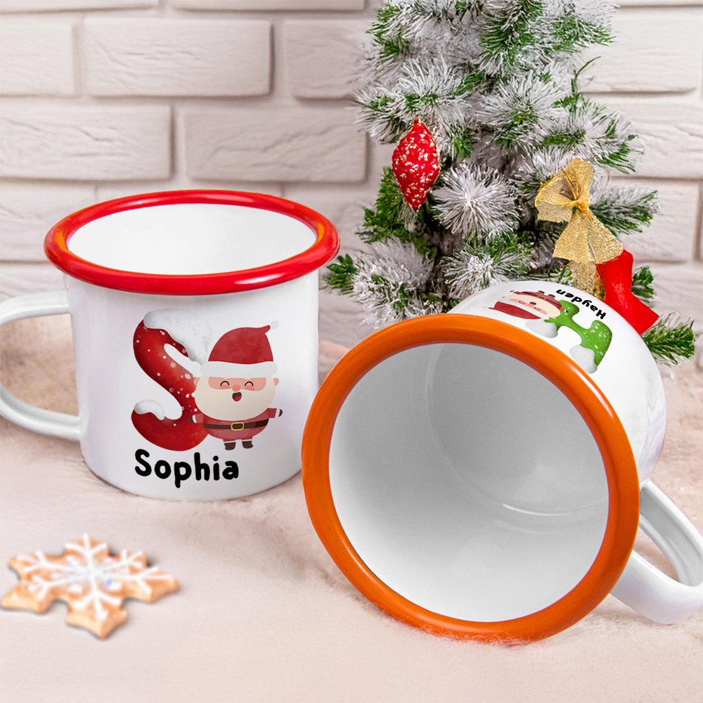 The enamel mug features festive Christmas motifs such as Santa Claus and snowy initials in classic red or green, set against a clean white background for a cheerful holiday vibe. With six colorful rim options to choose from, it combines a playful seasonal look with Personalised style, making every sip feel special and customized.