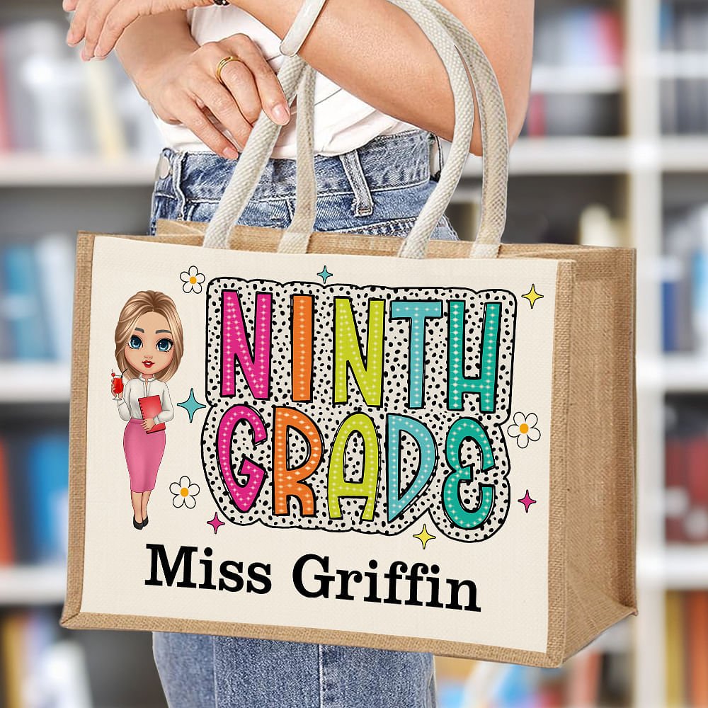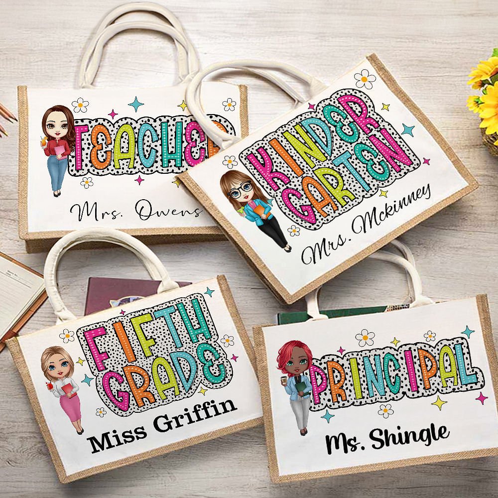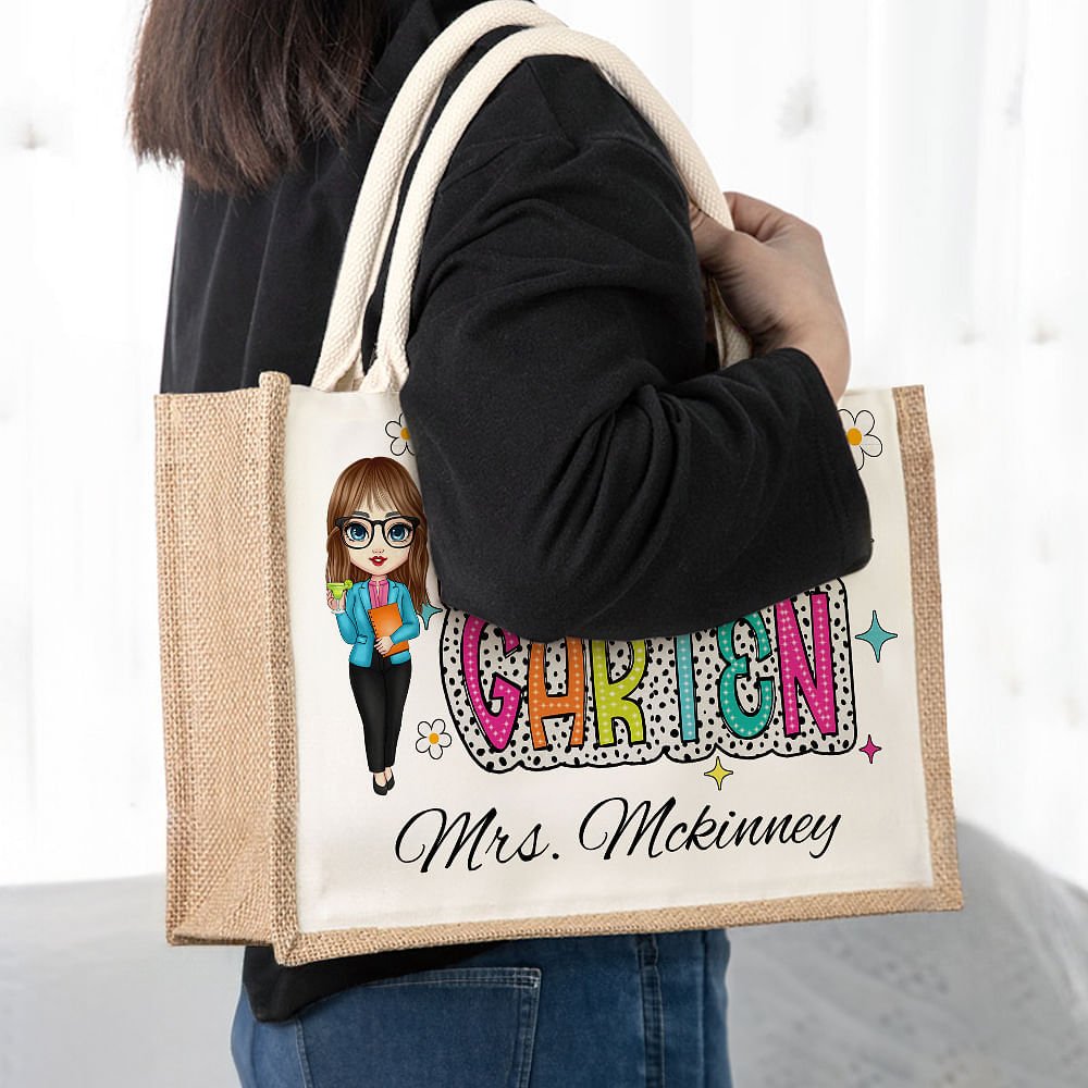 Crafted from jute, a sustainable and biodegradable material, this tote bag is not only environmentally friendly but also incredibly durable and sturdy. It can easily accommodate books, papers, and other essential items needed for a day of teaching.