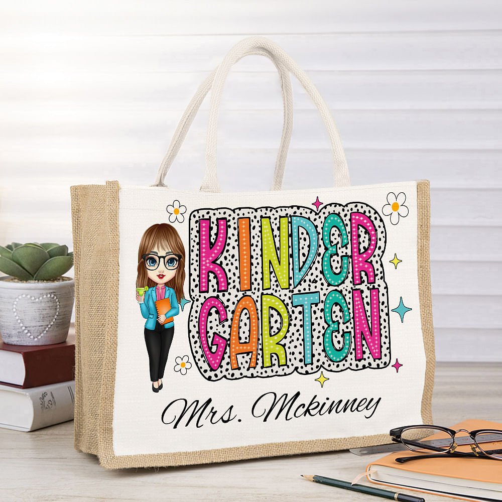 This stylish dalmatian dot tote bag features a one-of-a-kind design that can be Personalised with vibrant rainbow-style text to reflect the teacher's profession or grade. It can also be customized with the teacher's name and a charming cartoon image, making it a truly thoughtful and practical gift for the new school year.