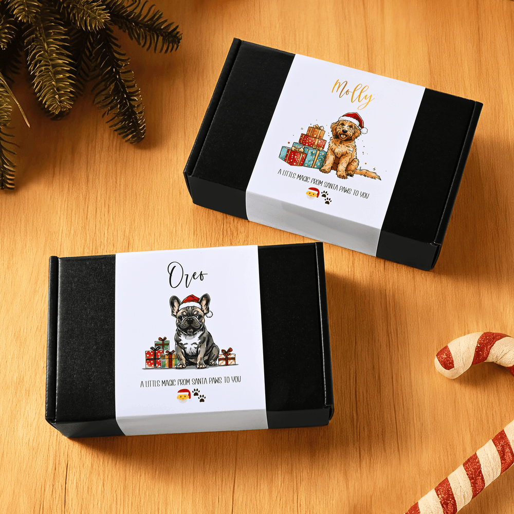 Centered around a Christmas dog motif, this design features a custom dog name alongside the heartwarming phrase β€œA Little Magic From Santa Paws to You.” Its style brims with festive cheer and adorable pet charm, perfectly aligning with the tastes of dog owners and enthusiasts.