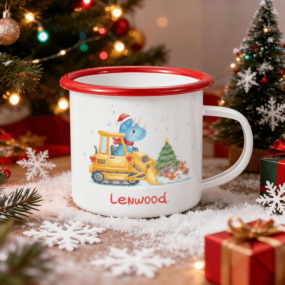 This charming enamel mug is designed for kids who love dinosaurs and construction vehicles. It features an adorable holiday dinosaur wearing a Santa hat, driving a construction Lorry decorated with Christmas lights and gifts. What makes it even more special is that you can customize it with a name, turning it into a unique keepsake that your child will cherish and use all year round.