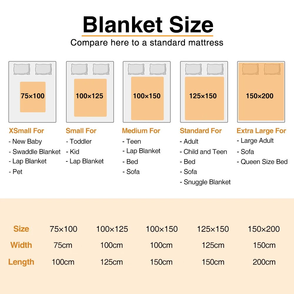 Measurement: Fleece Blanket - 30" × 40"(75cm × 100cm), 40" × 50"(100cm × 125cm), 40" × 60"(100cm × 150cm), 50" × 60"(125cm × 150cm), 60" × 80"(150cm × 200cm), Sherpa Blanket - 40" × 50"(100cm × 125cm), 50" × 60"(125cm × 150cm), 60" × 80"(150cm × 200cm)