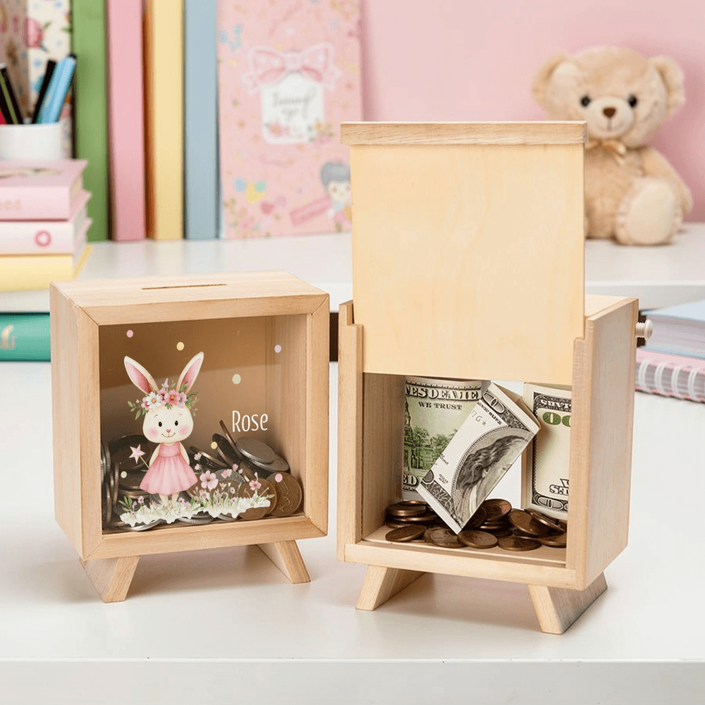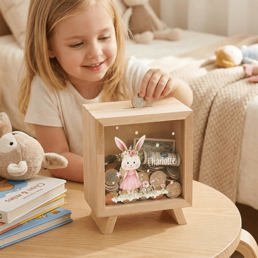This money bank features a charming floral bunny pattern paired with a customizable name, adding warmth and individuality to the special gift for children. With its soft colors and playful design, it brings a delightful decorative touch to a child's room or nursery.