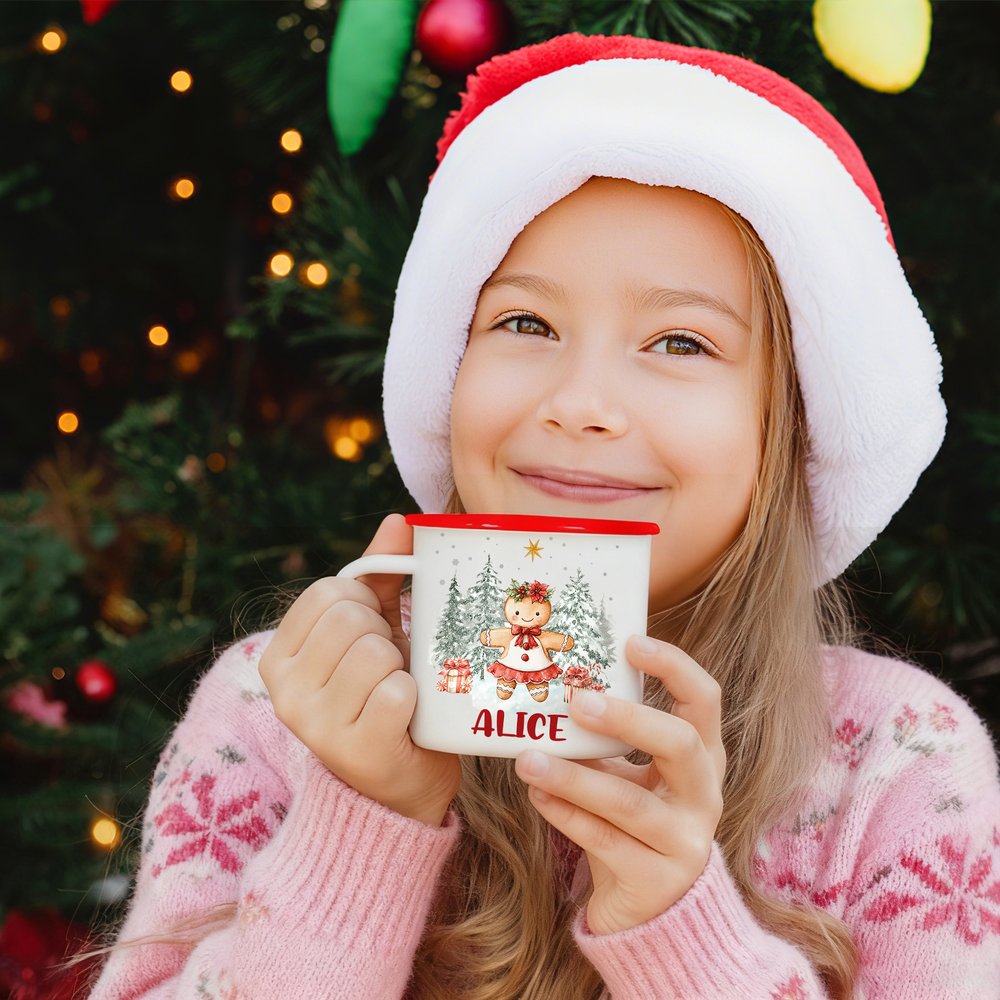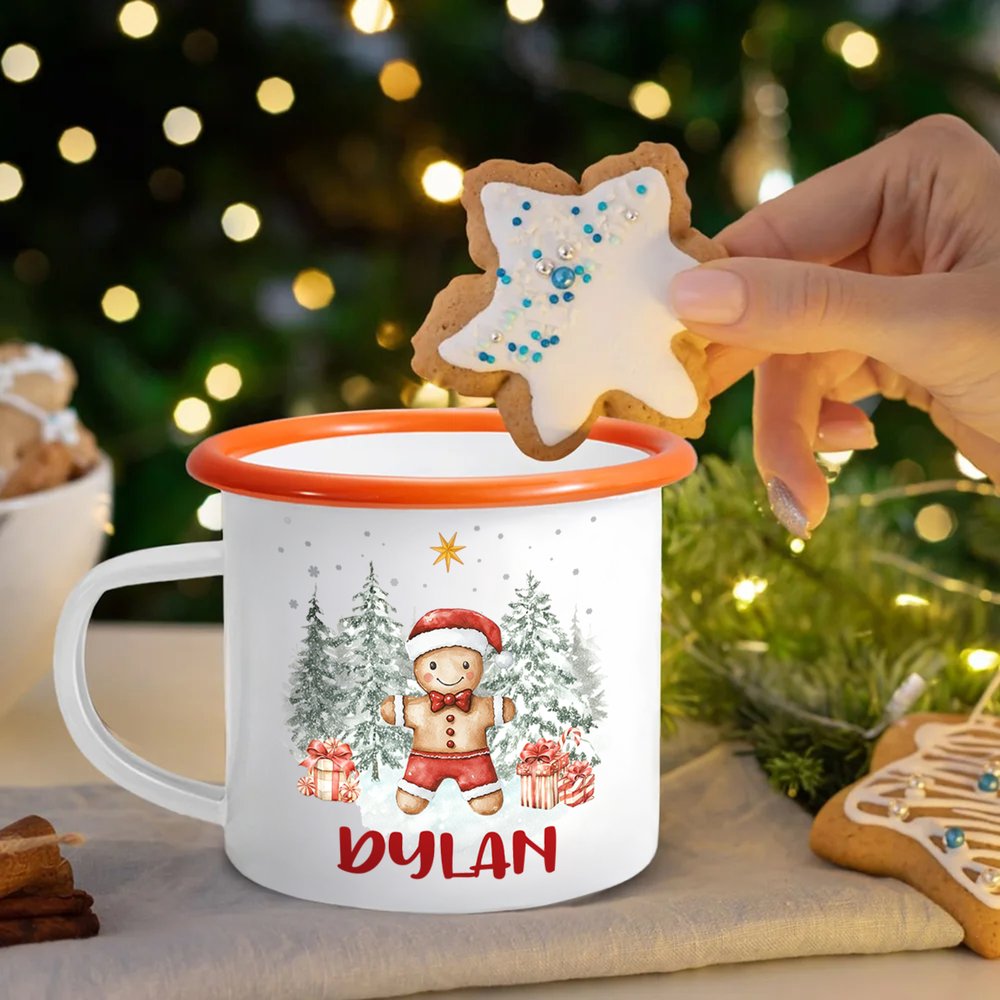 This enamel mug features an adorable gingerbread man as its central design element. The gingerbread man is depicted in a lifelike manner, dressed in festive attire and surrounded by classic Christmas patterns like Christmas trees and gift boxes, which creates a strong holiday atmosphere. Each mug can also be printed with a customizable name, adding a unique personal touch.