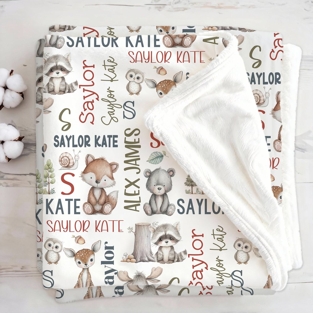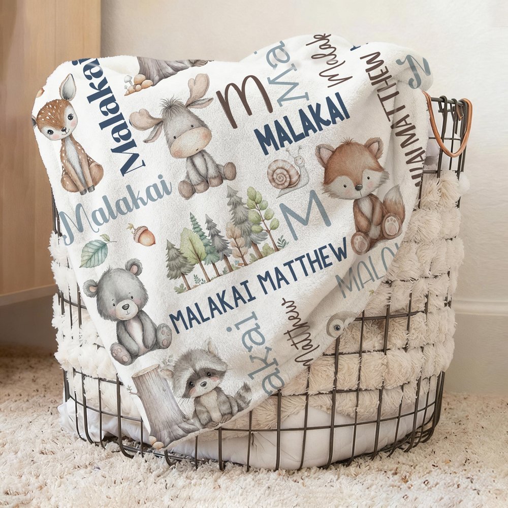 This charming blanket features adorable hand-drawn forest animals, including foxes, bears, deer, and raccoons, paired with the Personalised name and initial. Accents of pinecones and trees create a playful, nature-inspired aesthetic. Various font and colour combinations evoke a warm and serene visual effect, making it perfect for crafting a Personalised nursery.