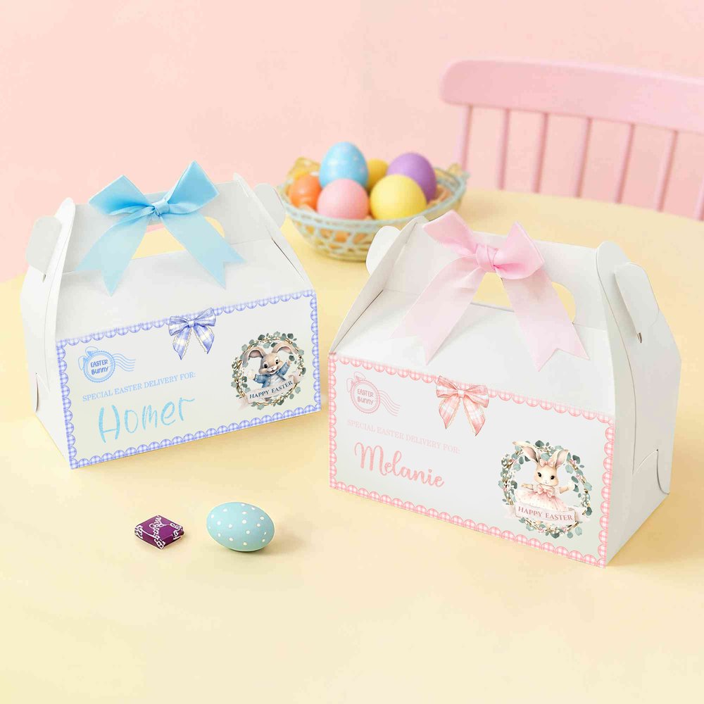 Featuring an adorable bunny design paired with a charming bow, this packaging box captures the essence of Easter. The combination of aesthetics and festive spirit is enhanced by the option for Personalised name customization, transforming it into an eye-catching gift that appeals to both adults and children.