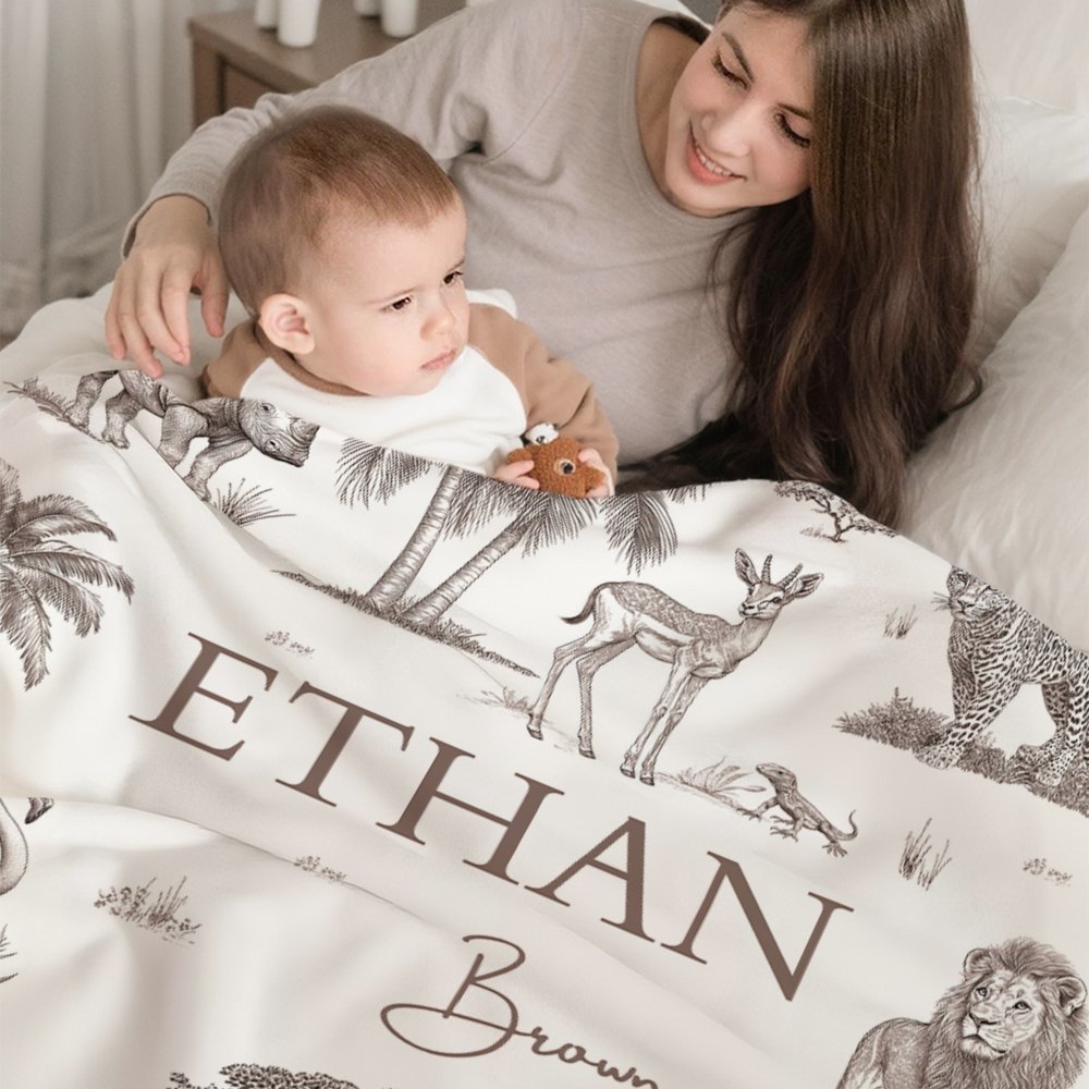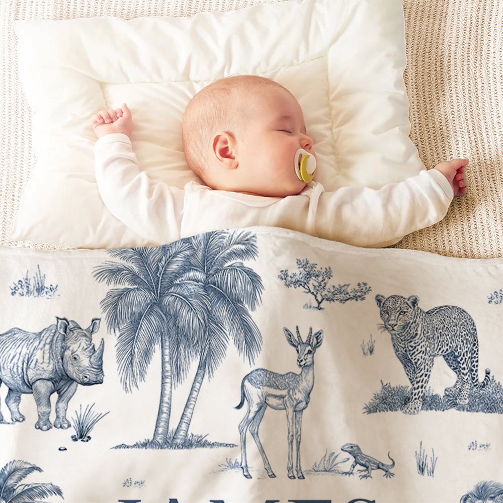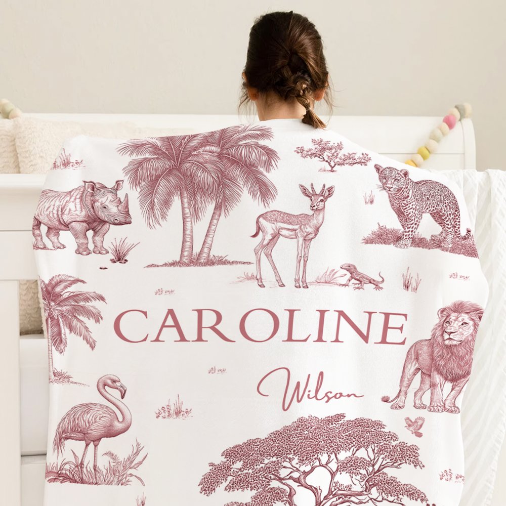 This blanket features a classic French vintage jungle animal pattern with soft tones, adding playfulness to kids’ rest time. It supports customizing children's names, making each blanket unique and memorable.