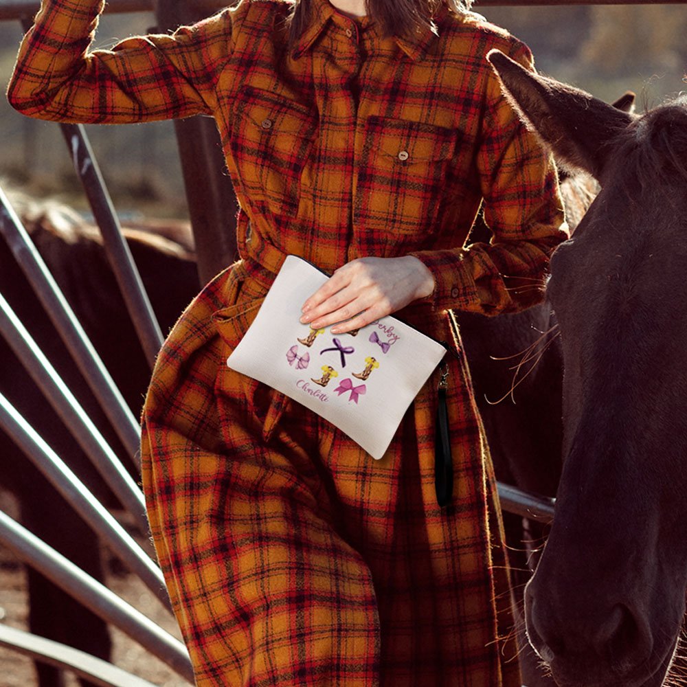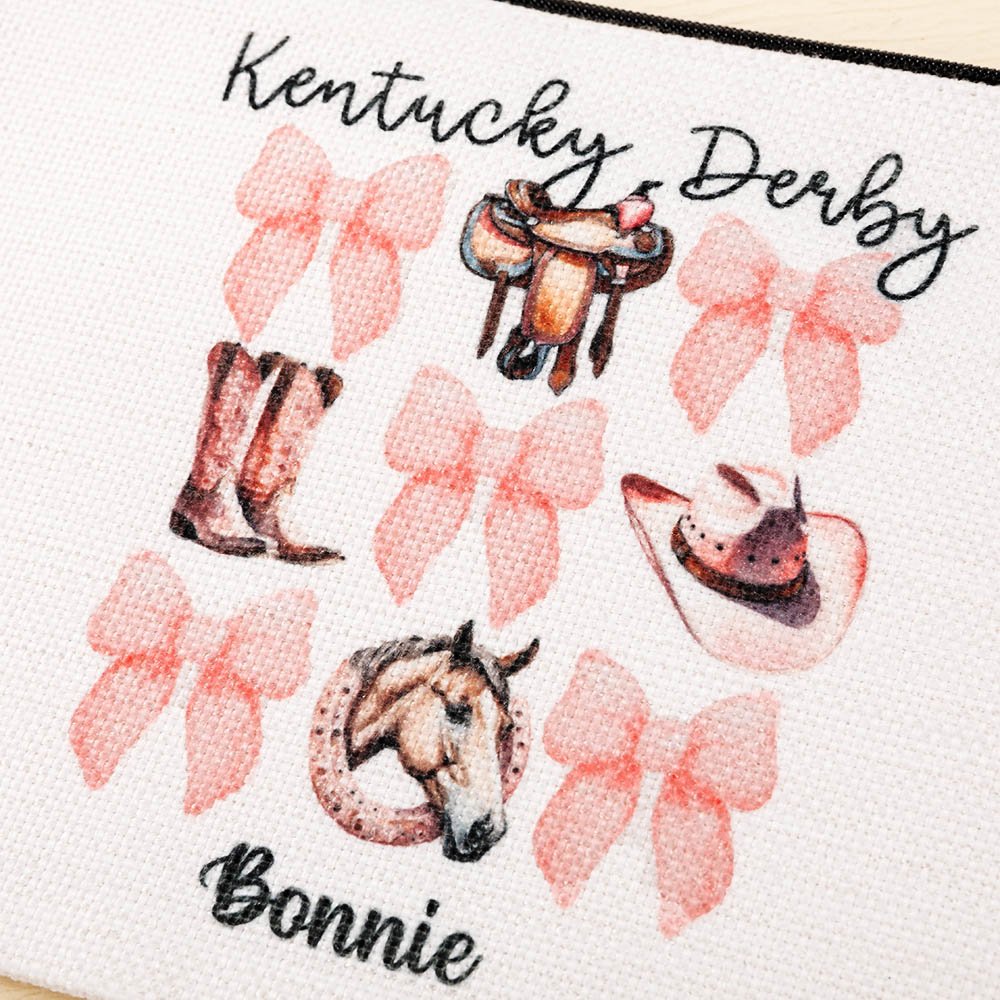 This cosmetic bag has an exquisite and charming design, inspired by the Kentucky Derby Horse Festival and fused with classic bow elements, to design a cosmetic bag full of fashion and elegance, showing feminine charm and personality. There are four designs to choose from. In addition, you can also customize your name on the bag for a truly unique and one-of-a-kind accessory.