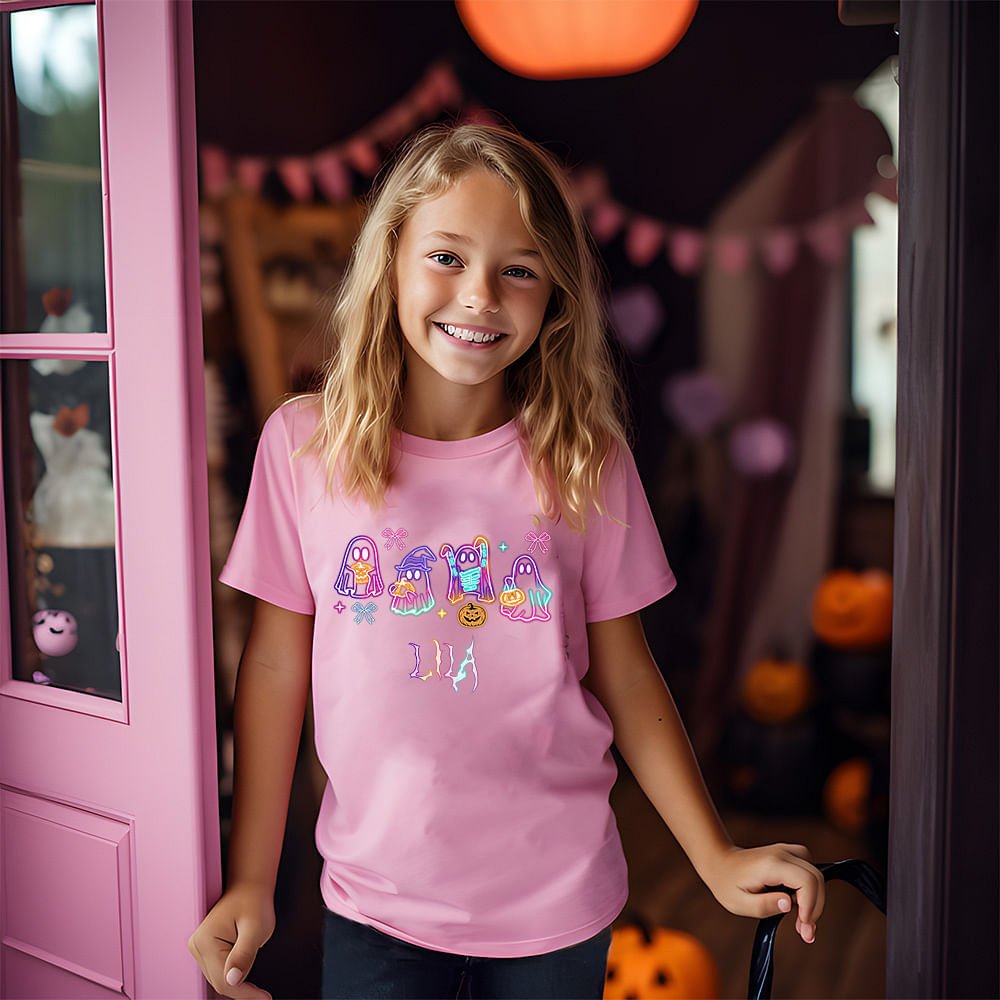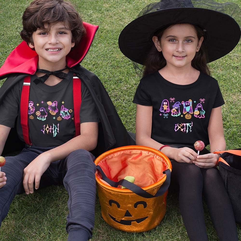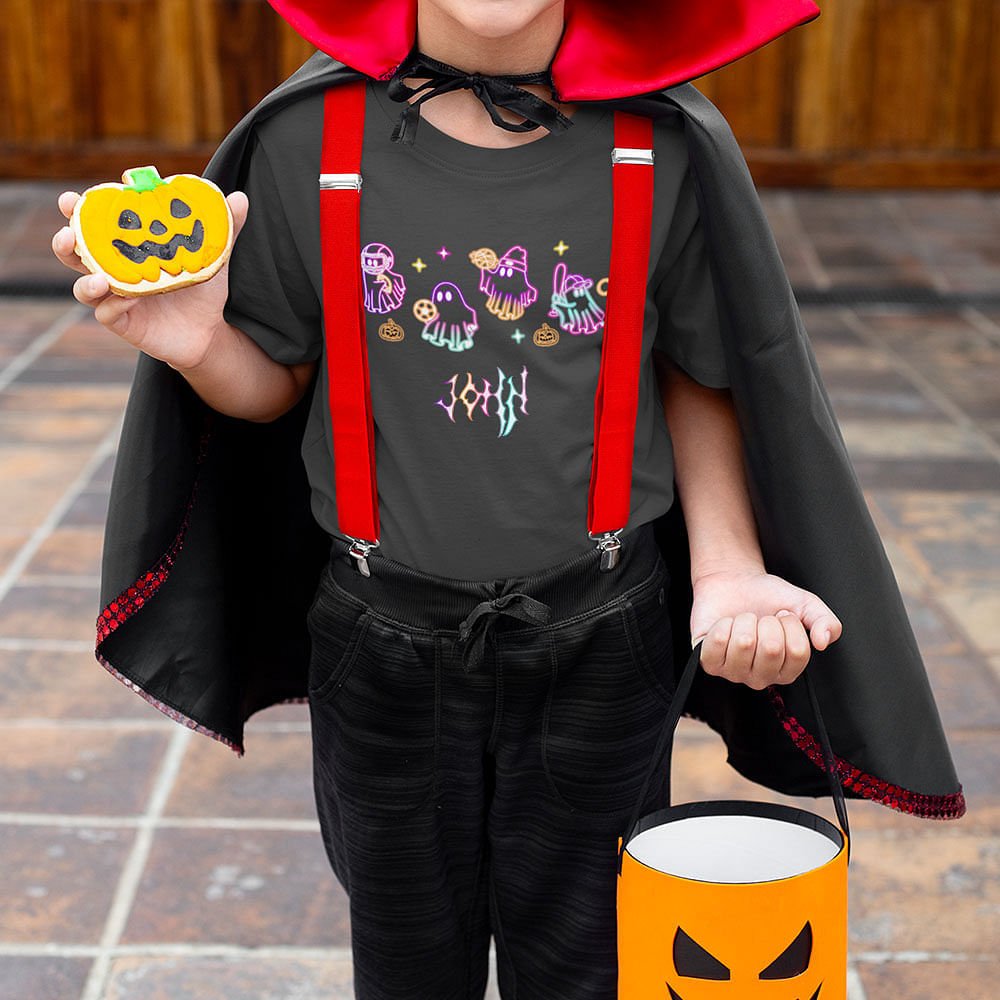 This T-shirt features bright neon colors and a cute ghost pattern, which instantly attracts attention and becomes the most eye-catching accessory at the Halloween party. It can also be customized with a name, whether it is a night street parade or an indoor party, it will make children focus and show their personality.