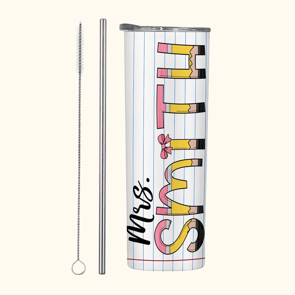 This skinny tumbler is a delightful and unique gift for teachers. The cute name design is pencil-inspired and can be customized with a teacher's title and name. Its playful and fun design makes it especially suitable for teachers so they can enjoy their drinks in style.