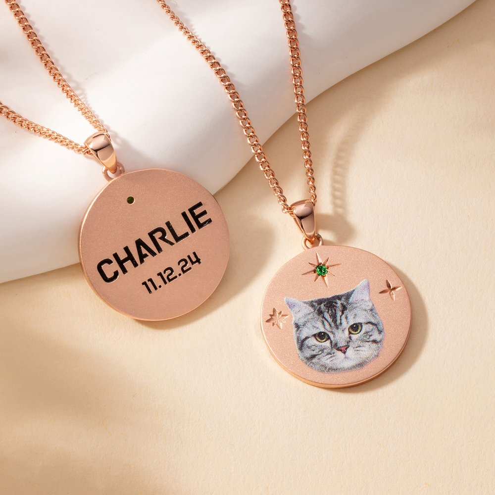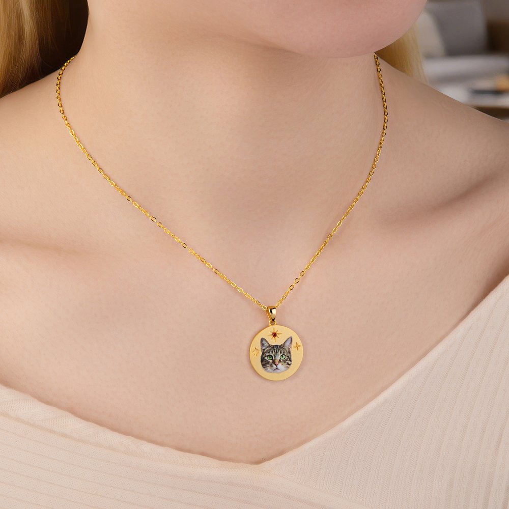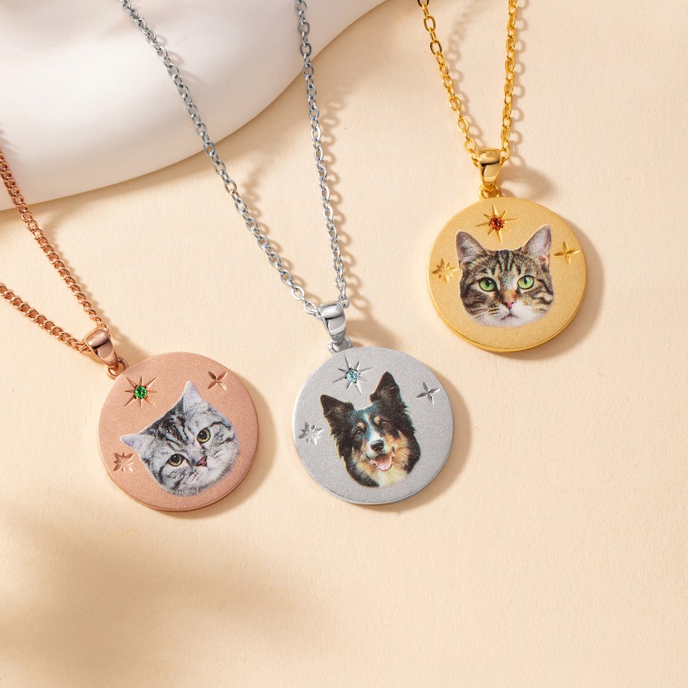 Featuring a close-up portrait of your pet's face, this pendant captures adorable moments and perfectly reproduces your pet's cute image. A mini birthstone adorns the top of the pendant, like a tiny crown for your furry friend. The back can be customized with text, allowing you to engrave your pet's name or a special message, encapsulating your love for your pet in this exquisite pendant.
