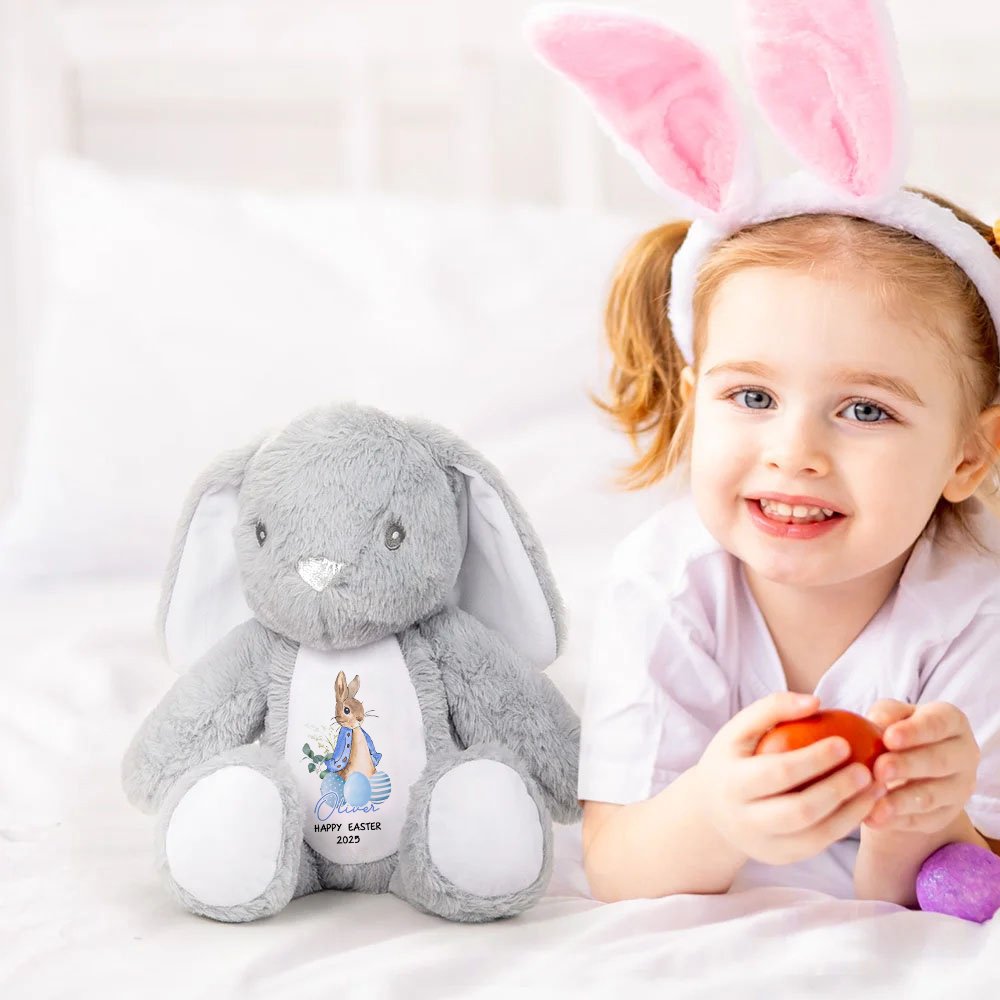 This adorable plush bunny toy features a charming Peter Rabbit design that captures the essence of this beloved character. The pink and blue color scheme further enhances the warm atmosphere. It features a customizable belly area to add special Easter messages, names, and years. It's a unique and thoughtful present that will be cherished for years.