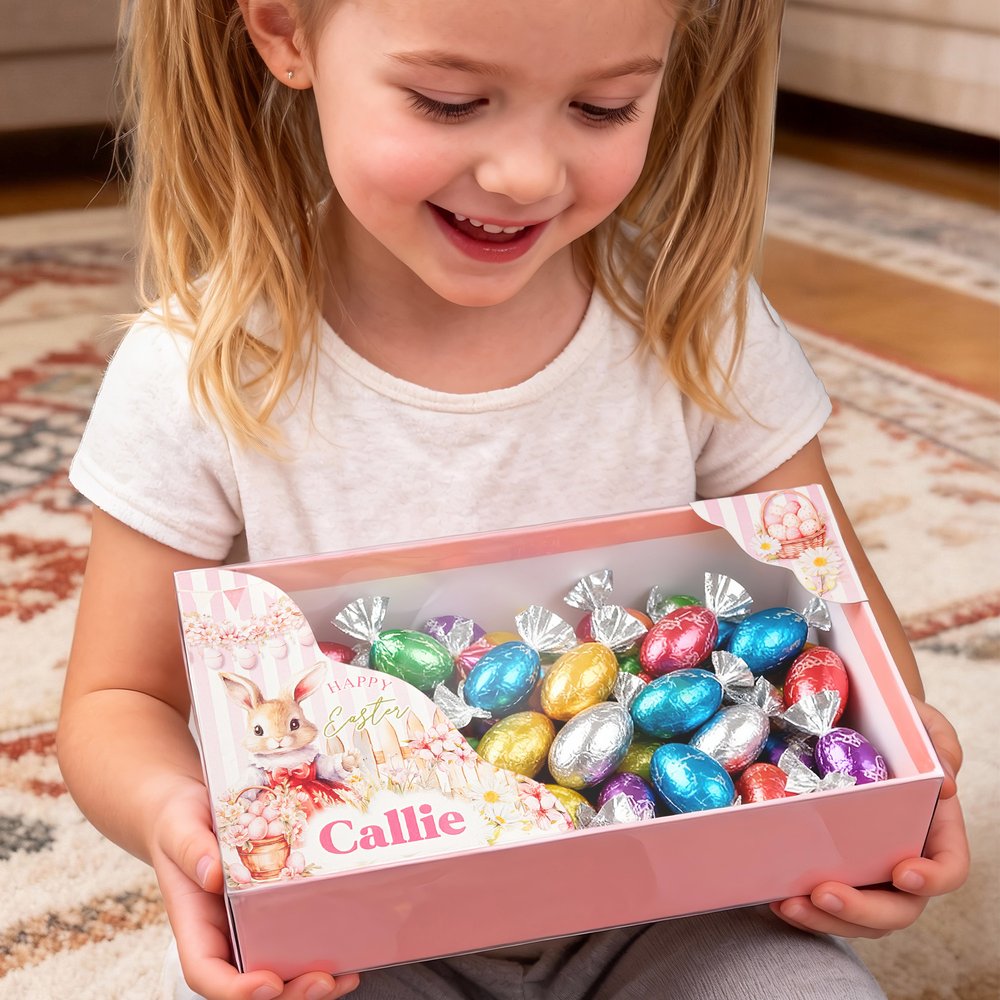 This Easter box features a Peter Rabbit theme, adorned with exquisite classic patterns on the exterior and a transparent lid that beautifully showcases the carefully arranged contents inside. The box supports personalization—you can have the recipient’s name or a heartfelt message printed on it, making it a unique keepsake for the holiday.