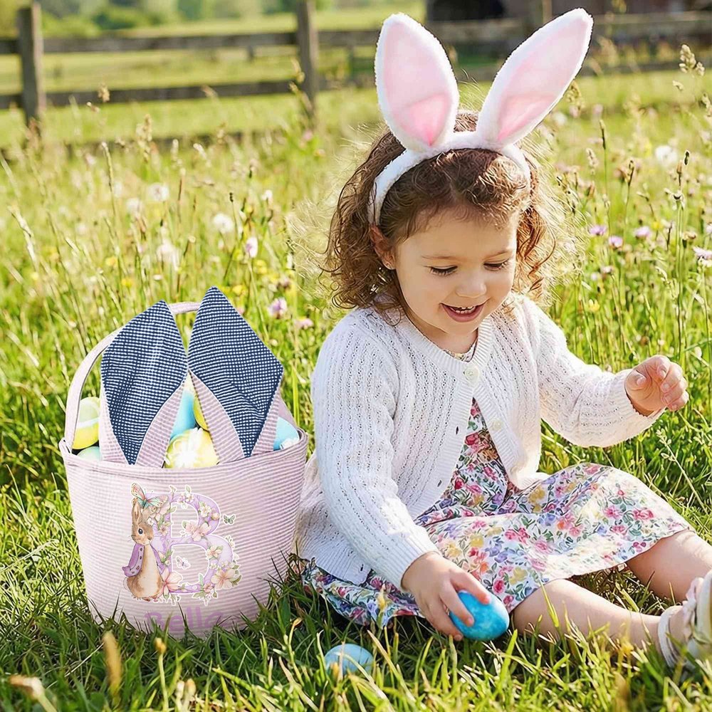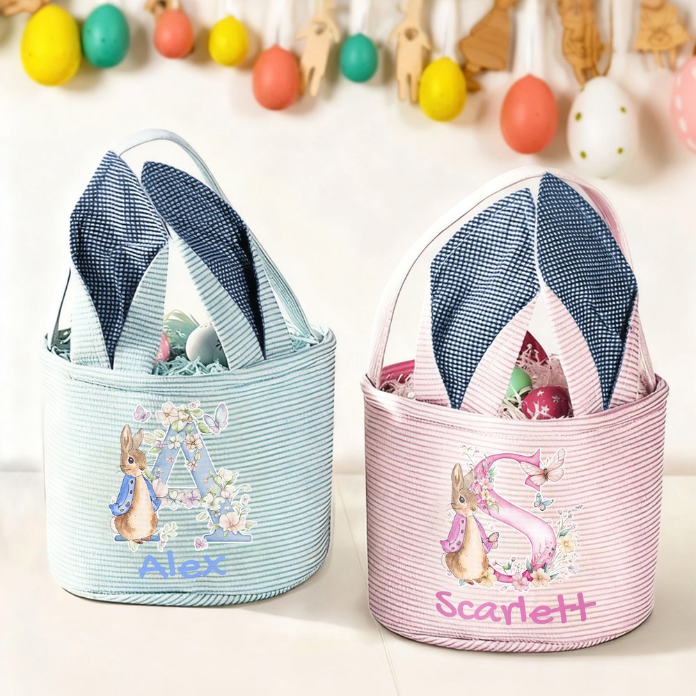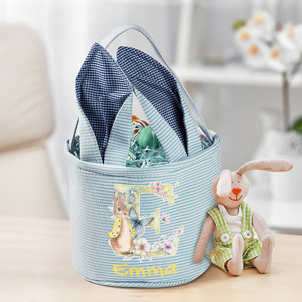 This Easter basket features the classic Peter Rabbit as its core element, complemented by flowers, butterflies, and an initial, giving it a festive feel. The basket boasts adorable bunny ears and a contrasting striped design, and is available in four colors: pink, green, blue, and purple. Each basket is customized with the initial and the kid's name, making it a unique symbol of the Easter holiday.