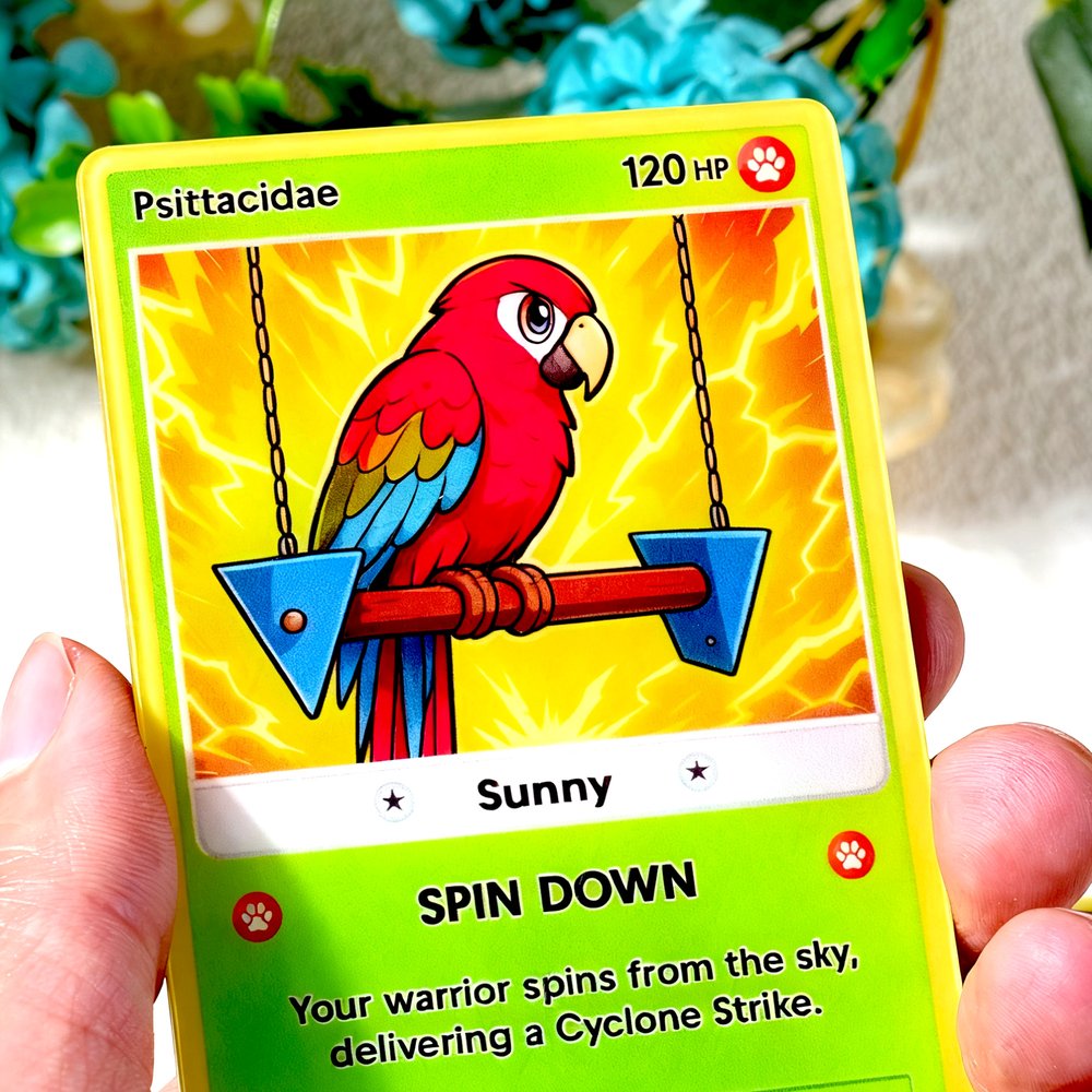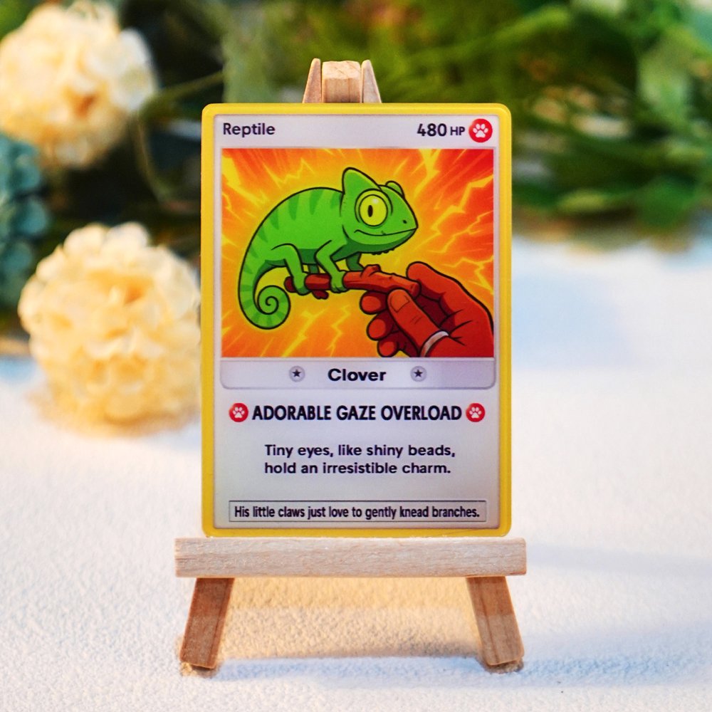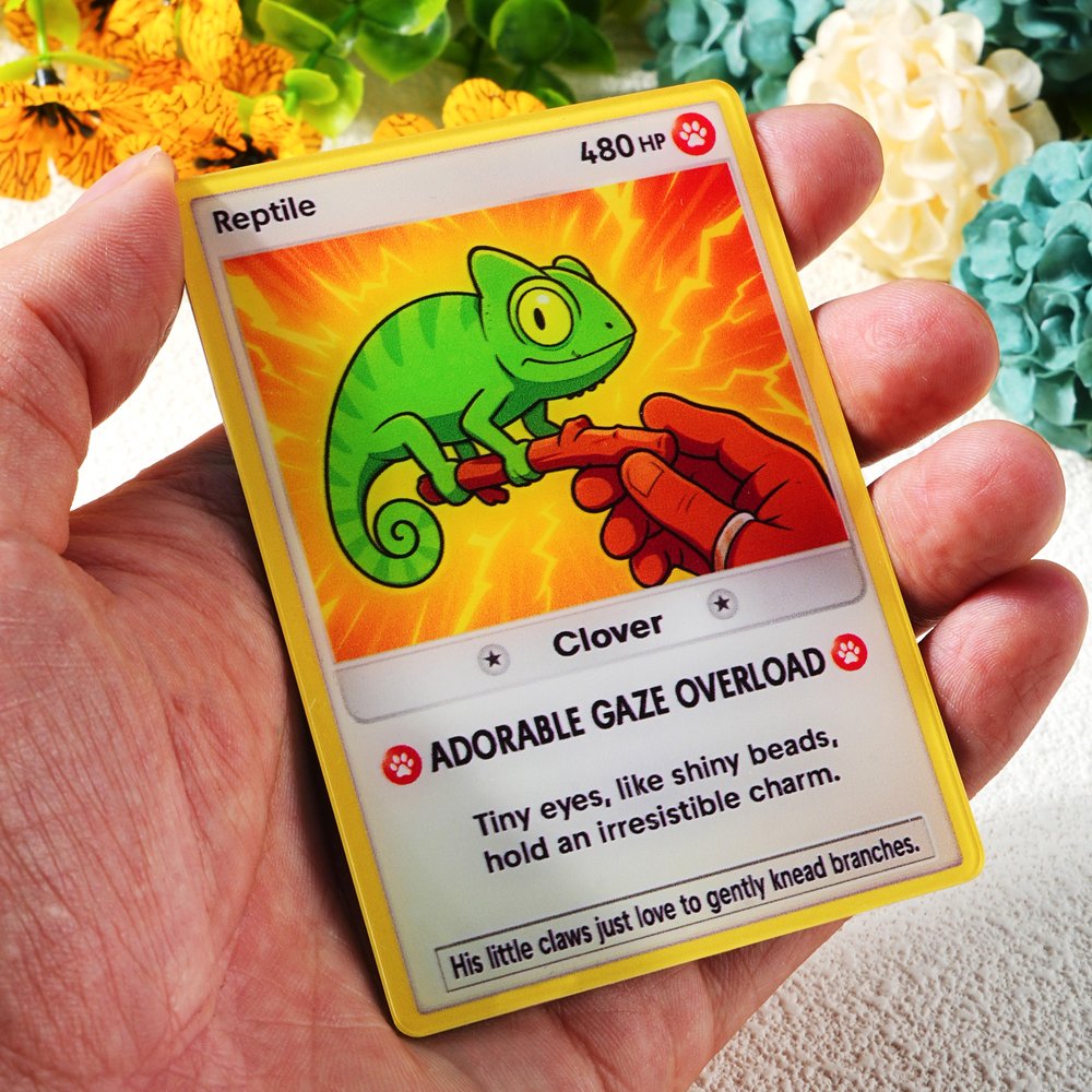 Upload a photo of your pet or any other favorite photo as the main image on the front of the game card, and carefully design your own unique card information. This includes a title, name, health point/year, creative attack name, descriptions, and bottom text. Besides, if you choose a shattered glitter card, you can see the refracted brilliant light under the light.