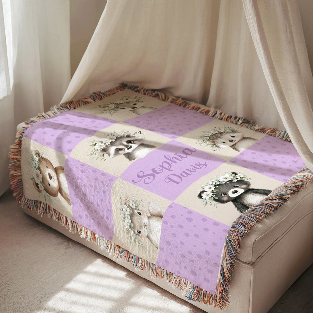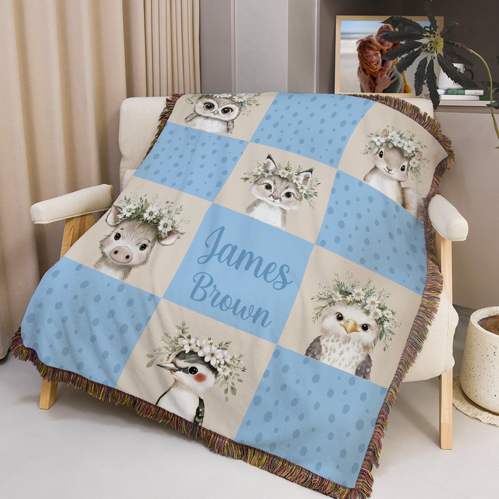 The style blends whimsical nature art with classic patchwork, creating a look that’s both child-friendly and aesthetically pleasing. You can choose 6 adorable animal designs (from options like foxes, raccoons, squirrels, and otters), select a base color, and input a name & surname, turning the blanket into a one-of-a-kind piece that blends playful nature themes with personal identity—perfect for anyone wanting a tailored cozy accessory.