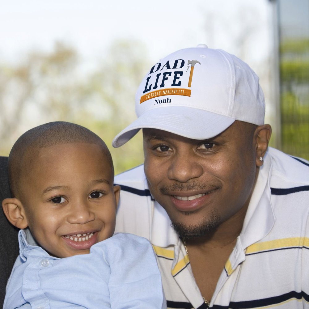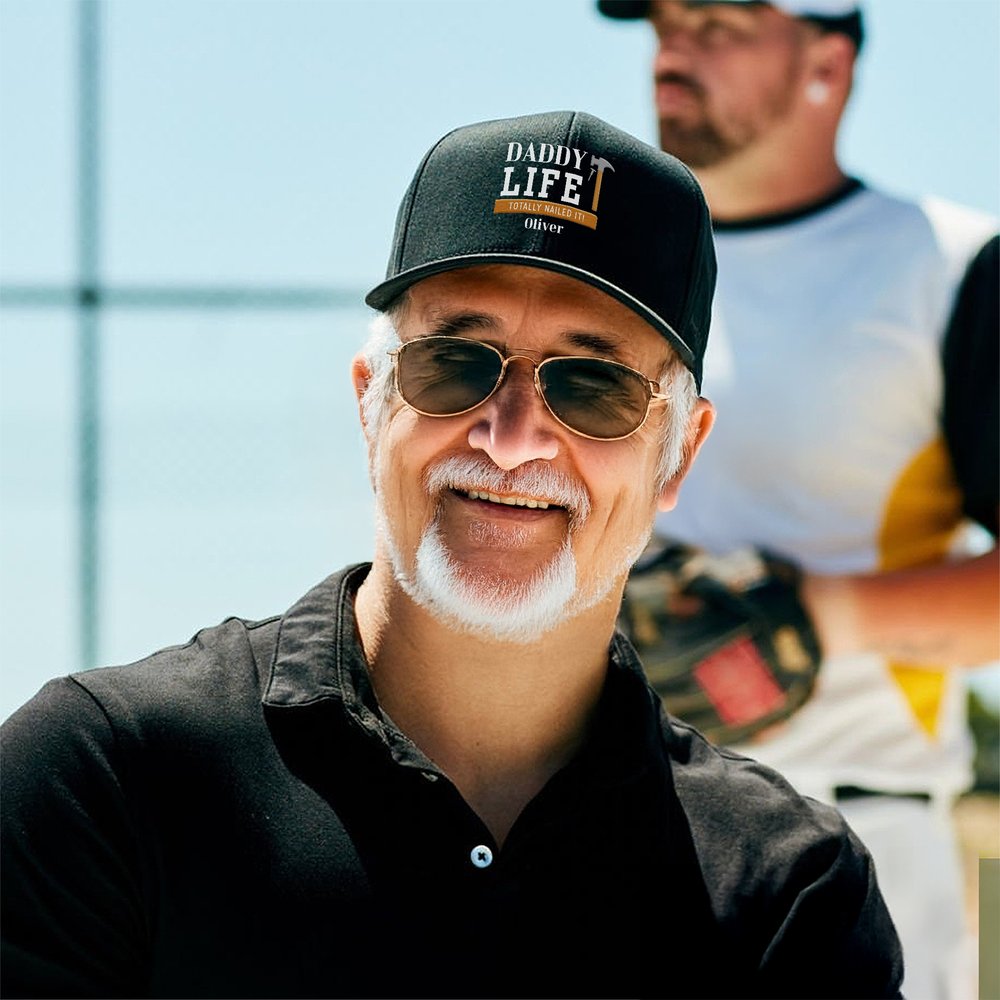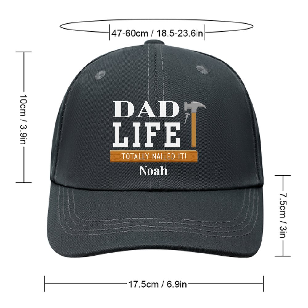 This cap features "DADDY LIFE" and a hammer logo as its core design elements, creating a masculine look with a playful graphic design. The customizable name area at the bottom elevates the hat from an ordinary accessory to a unique statement piece showcasing your style. The "TOTALLY NAILED IT!" banner conveys a sense of confidence and celebration, creating a recognizable statement piece.