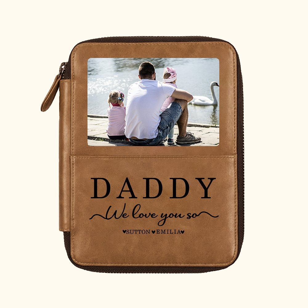 What sets this leather passport wallet apart is the option to add a cherished photo and Personalise it with 1-5 kids' names, creating a truly unique and meaningful keepsake for dad or grandpa.