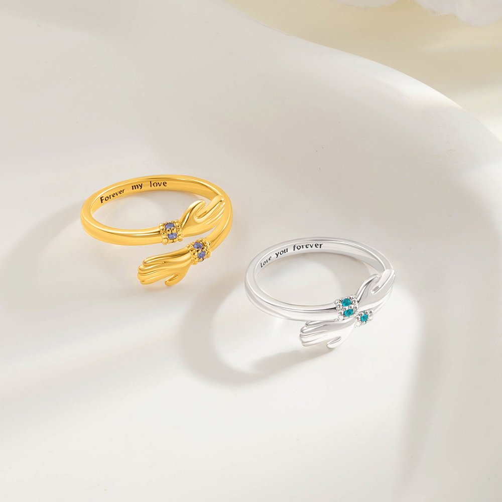 Featuring a lovely hugging hands pattern, the ring is finely engraved to capture the essence of a warm embrace. It is a subtle yet powerful symbol of love and unity. The unique birthstone setting adds a personal touch, allowing you to celebrate a special month or precious moment. You can also engrave a special message on the inside of the ring or choose a card to express your warm and sincere love.