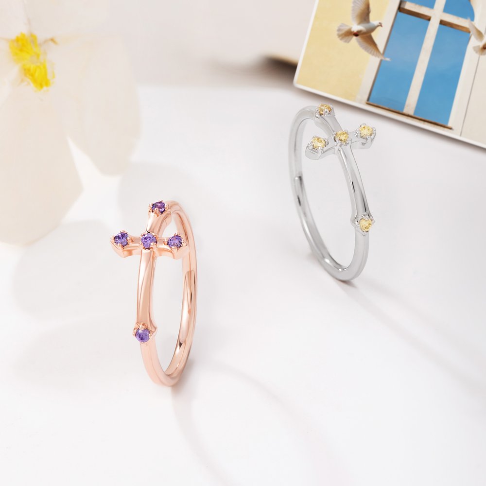 Born from Christian faith, this ring unites the sacred symbol of the cross with the personal beauty of a birthstone—a unique treasure that lets you carry your faith with you, close to your heart.