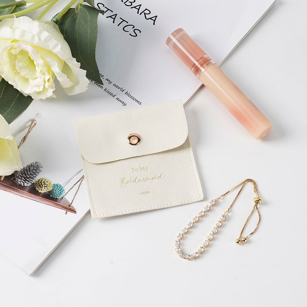 Discover the elegance of our exquisite bracelets, a stunning collection designed to make every bride and her wedding party shine! Connected by sparkling diamonds, the bracelets catch the light beautifully. You can engrave your name and title of choice on the front of the jewellery bag, turning it into a precious keepsake celebrating love and friendship.