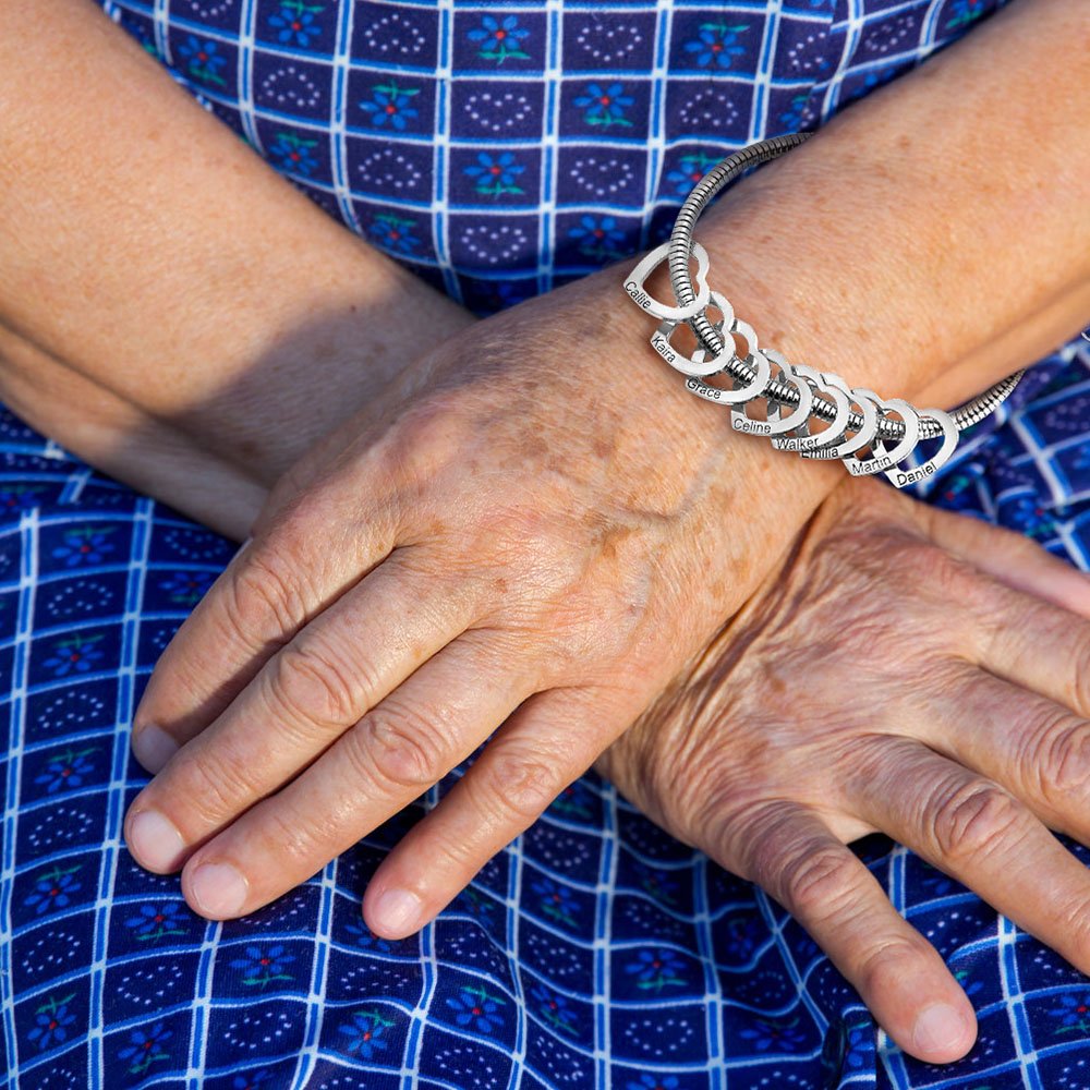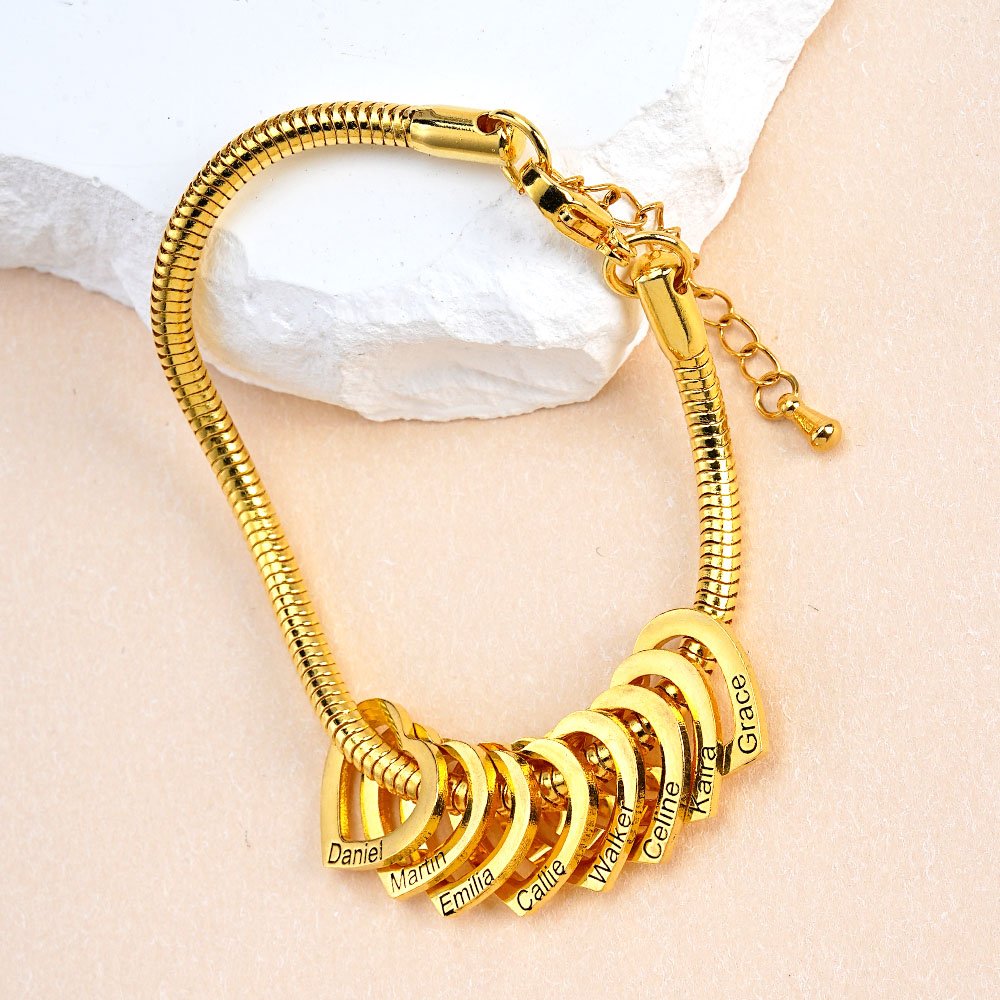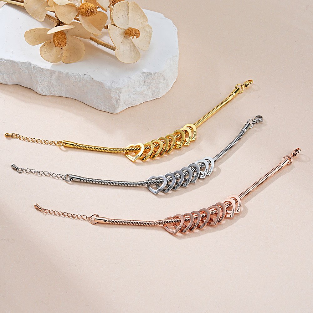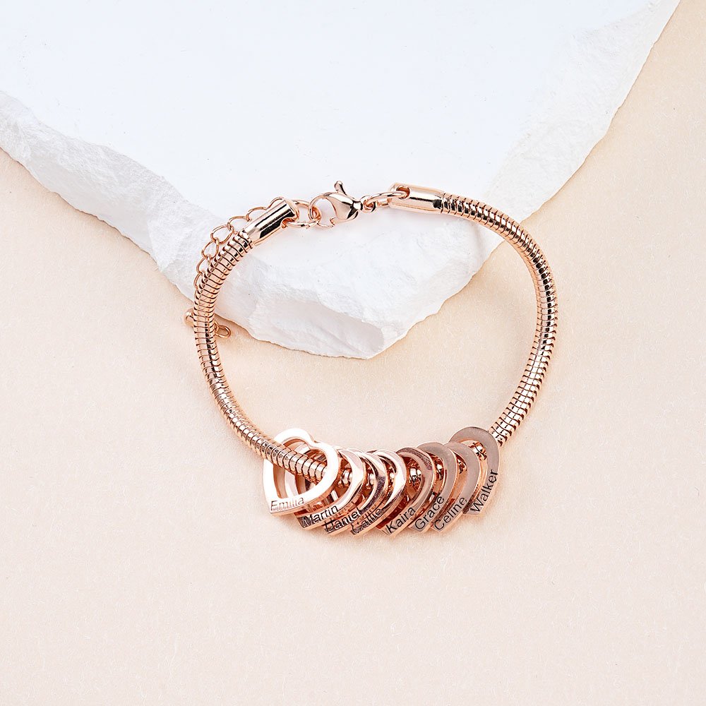 The design of this bracelet is full of family warmth and love. There are 1-12 small and exquisite heart-shaped charms in series in the center of the bracelet, and each heart can be customized with the name of a family member. This design symbolizes the reunion and harmony of the family, and each name carries love and blessings, which is a perfect way to express family emotions.