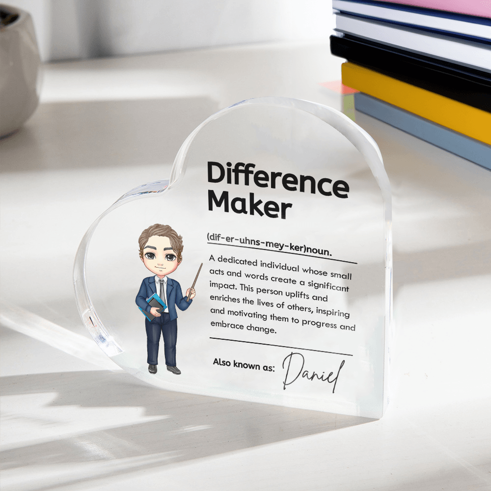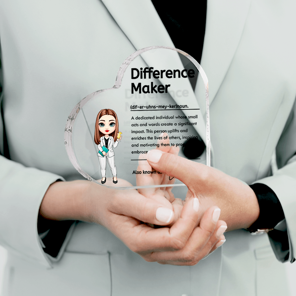 The design of this acrylic plaque focuses on an eye-catching title "Difference Maker" and the definition explanation that follows it refers to those people who create a positive impact through their actions. With a cute heart shape, you can customize your cartoon character image and name on the surface of this plaque, adding a warm and unique atmosphere.