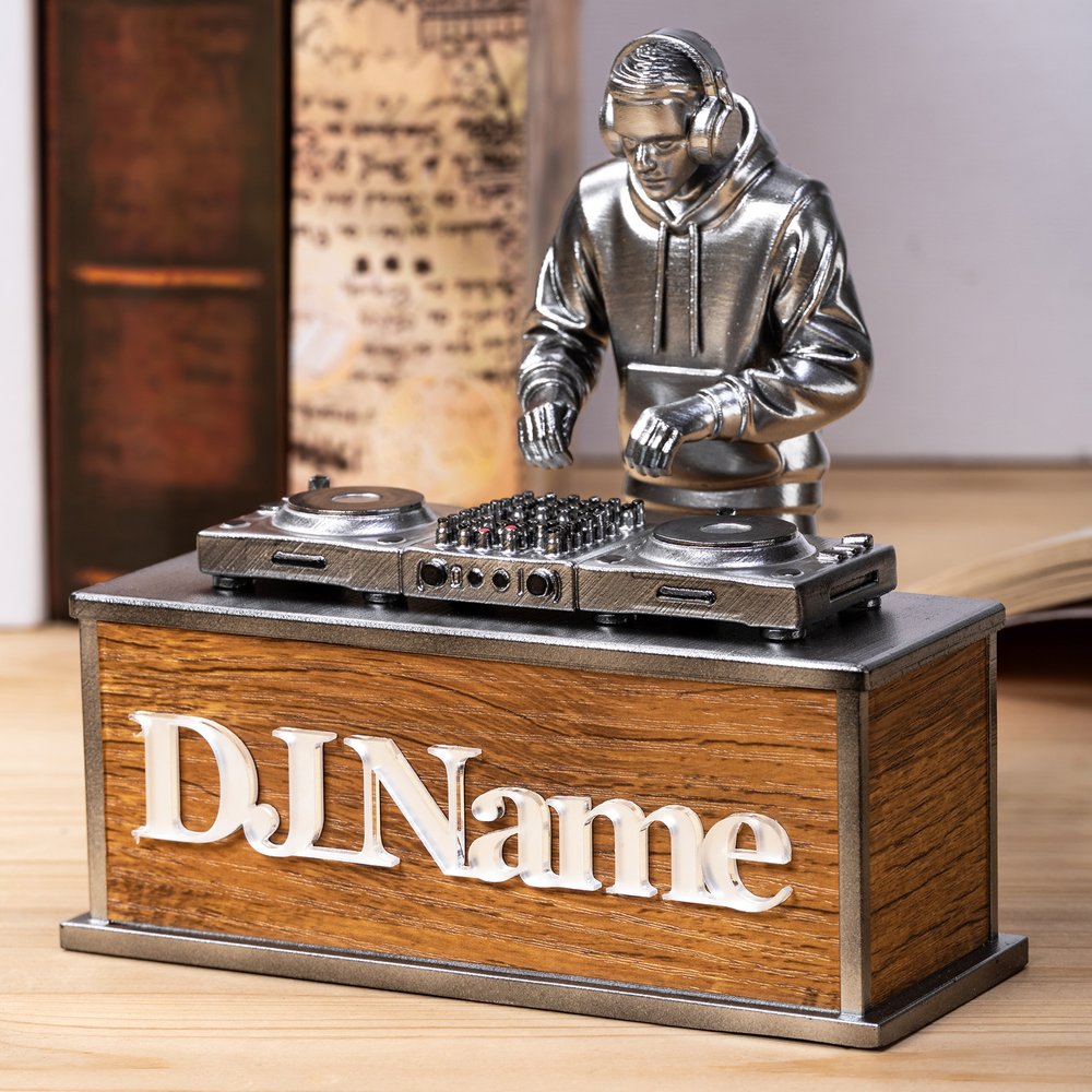 Inspired by electronic music culture, this DJ figurine recreates the classic scene of a DJ performing at a mixing console. Every detail—from the turntables and mixer to the dynamic DJ pose—is finely captured. Available in male and female versions. The base is customizable with a unique DJ name, blending musical identity with personal style. The vintage distressed metal finish paired with a wooden textured base offers a perfect balance of trend and artistry—making each piece a one-of-a-kind signature piece for any DJ.