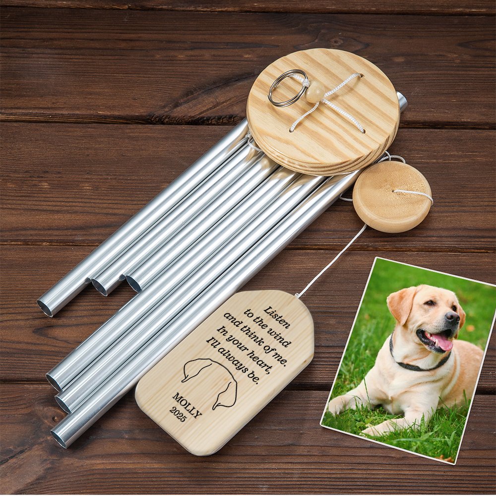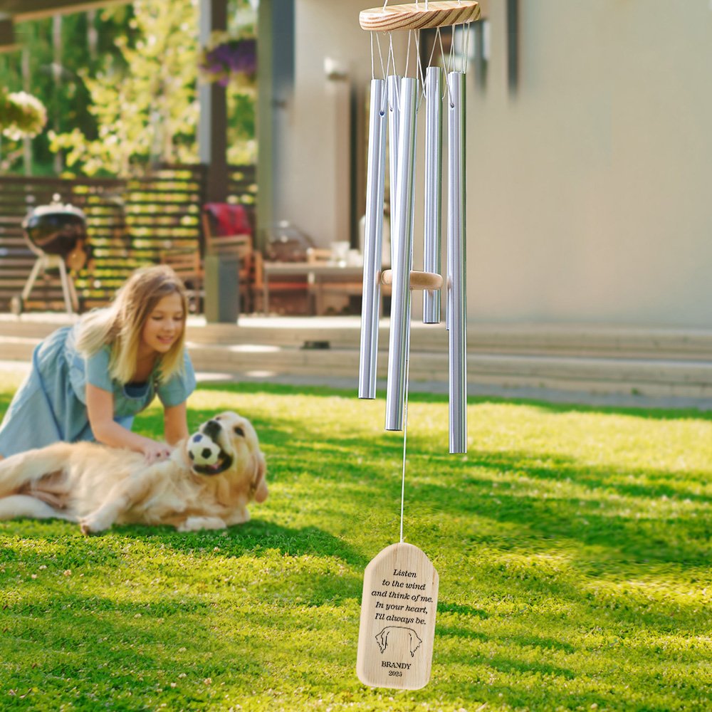 This wind chime features a beautiful dog ear silhouette design, which prints a poignant memorial message and customizes your pet's name and special memorial date. It symbolizes the love and bond shared with a beloved pet, making it a heartfelt tribute to a furry friend.
