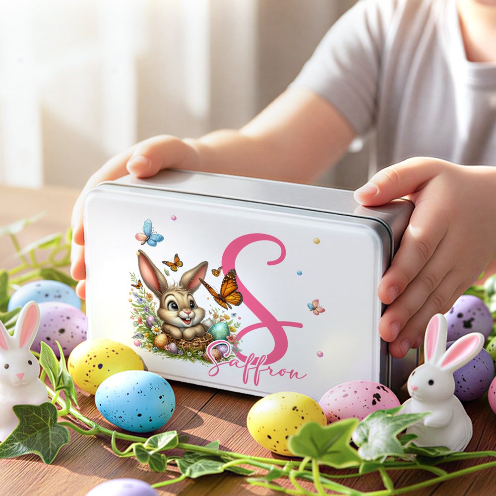 Features an adorable Easter bunny illustration paired with a customizable initial and name, making each biscuit box unique and creating a festive and cheerful look that makes this tin box a charming holiday keepsake.