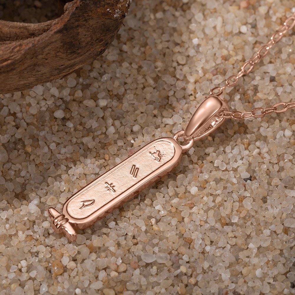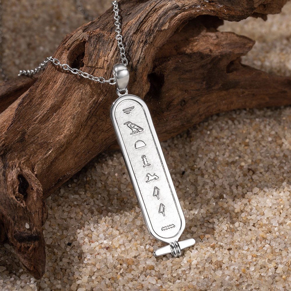 In Egyptian hieroglyphics, a cartouche is an oval framed plate with a line at the bottom on which is written the name of the royal family. If the name is appropriate, the torus will be read vertically. In addition to this, it can also be read horizontally. At that time, only the pharaohs of ancient Egypt would wear swirls. The vortex symbolizes protection from evil and good luck. It is believed that the frame of the pendant protects the person whose name is written on the swirl from evil spirits even after death. This item draws on the disc necklaces of the pharaohs in ancient Egypt, hoping to bring good luck.