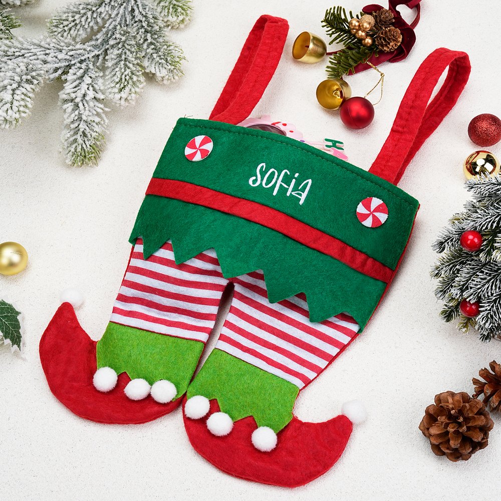 Featuring elf pants as the core creative element, these unique Christmas stockings boast a classic red and white color scheme, fluffy fleece trim at the cuffs, and snowflake and other Christmas elements printed throughout. The waistband can be customized with your name, transforming it into a Personalised Christmas gift bag.