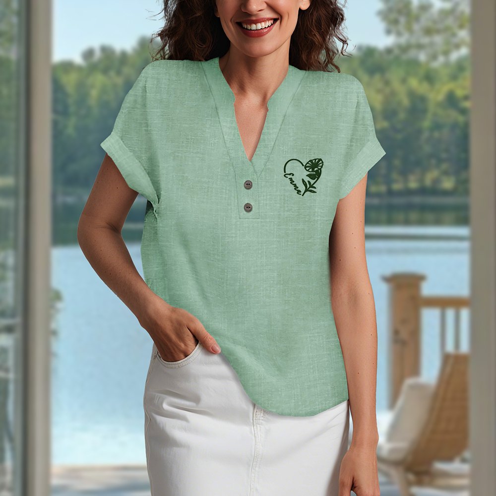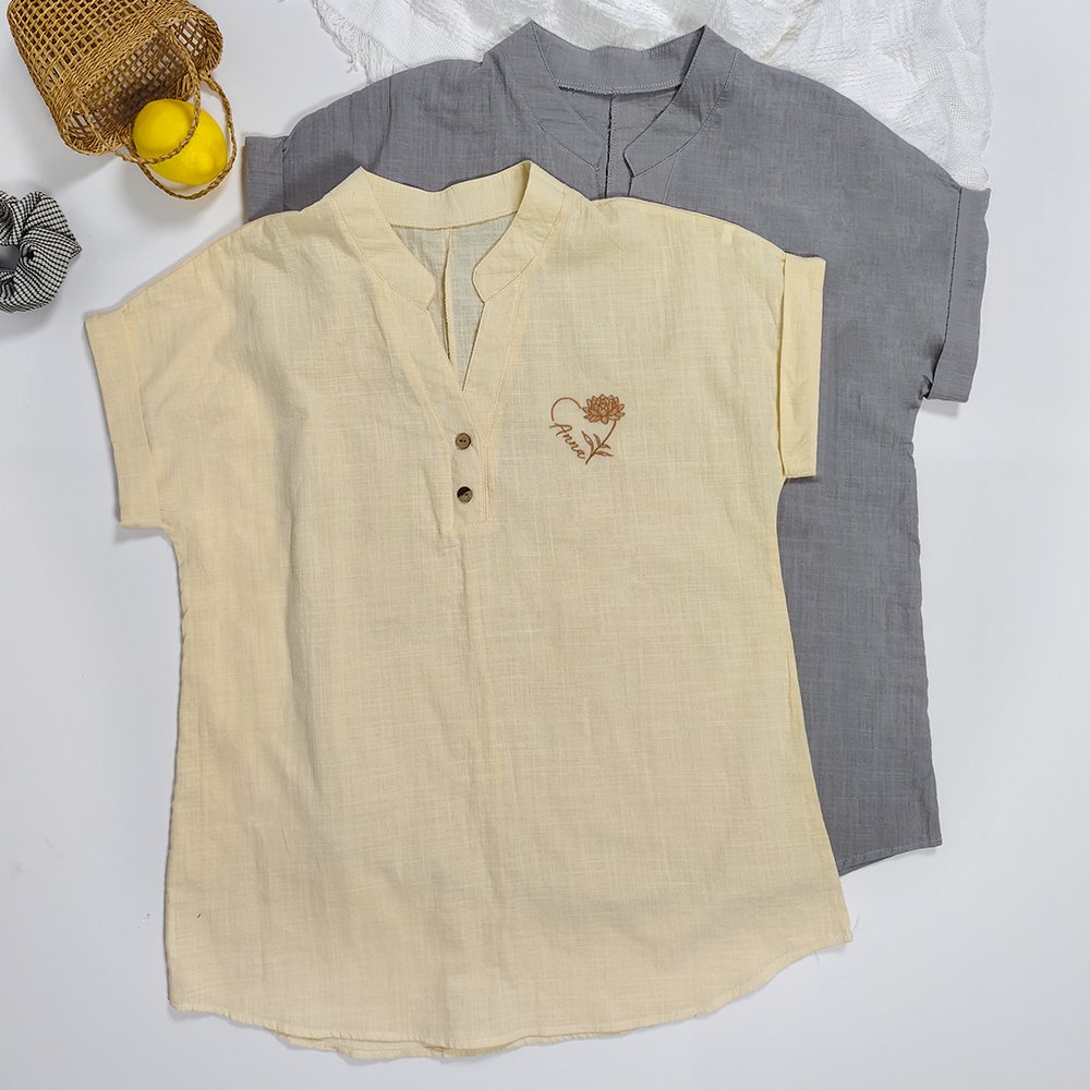This stylish short-sleeved women's shirt features an exquisite birth flower embroidery pattern on the left chest. There are two styles to choose from, and it can be customized with your name. It is elegant and chic, and it also adds a Personalised element to highlight the unique beauty and taste of women.