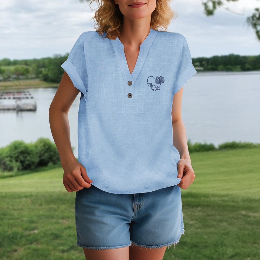 The cotton and linen fabric is sweat-wicking and breathable, soft and light, ensuring a comfortable fit, perfect for daily wear or special occasions. The loose version is suitable for summer, the V-neck design adds more temperament, and the embroidery details are more textured and add a unique charm, making it a versatile item that can be perfectly matched with any outfit.