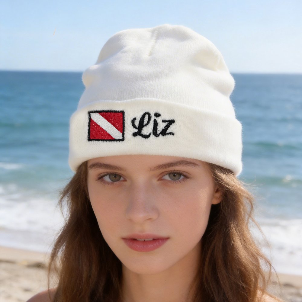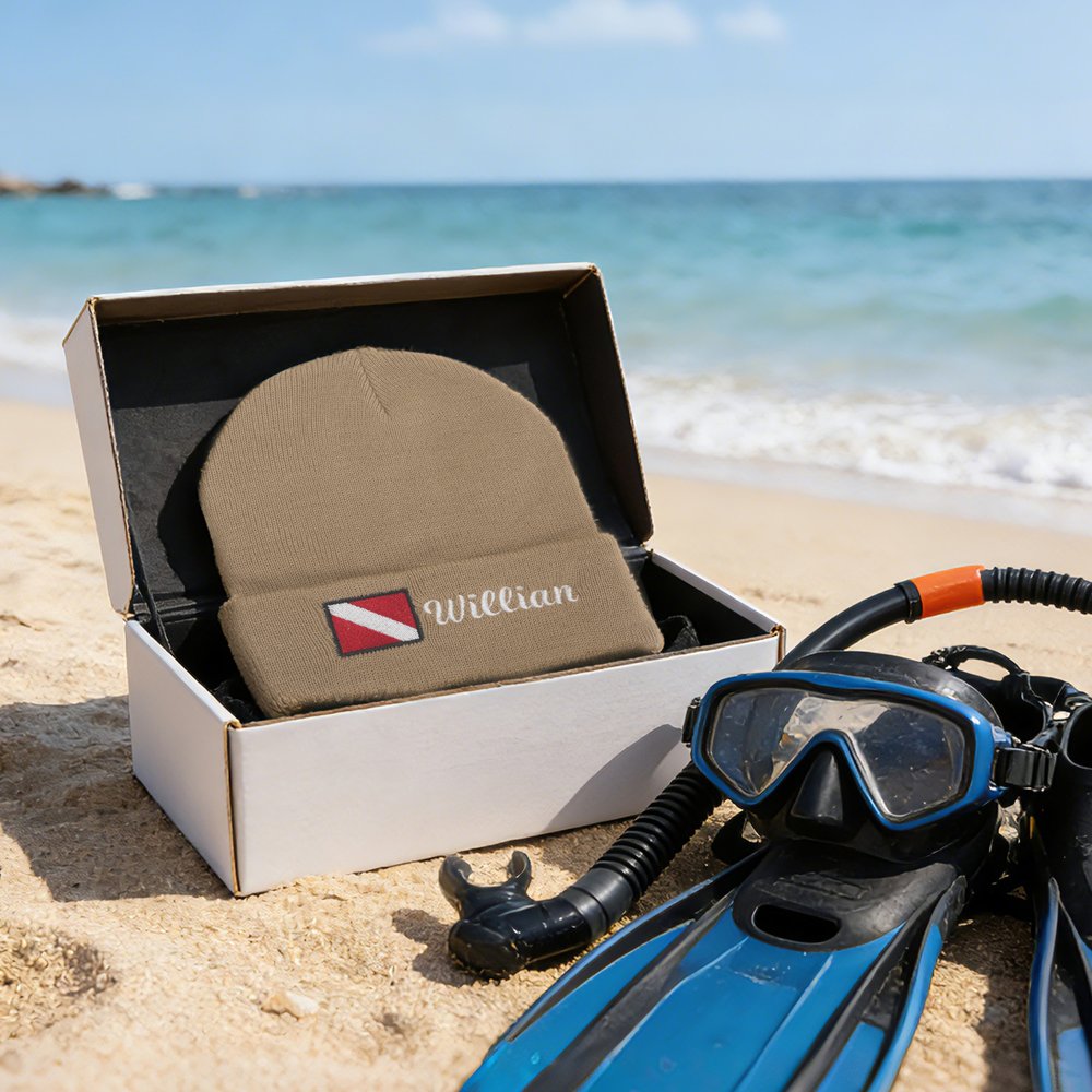 Elevate your diving gear with our one-of-a-kind Personalised Embroidered Diver Flag Knit Beanie, a must-have accessory for every scuba diving enthusiast! This stylish beanie features the iconic red-and-white diver down flag, a universal symbol recognized by divers worldwide, expertly embroidered on the folded cuff for a premium, long-lasting finish. The highlight is the fully customizable name embroidery—choose your favorite font and thread color to add your name, nickname, or a special phrase, turning a simple knit hat into a unique, Personalised statement piece that showcases your passion for diving.