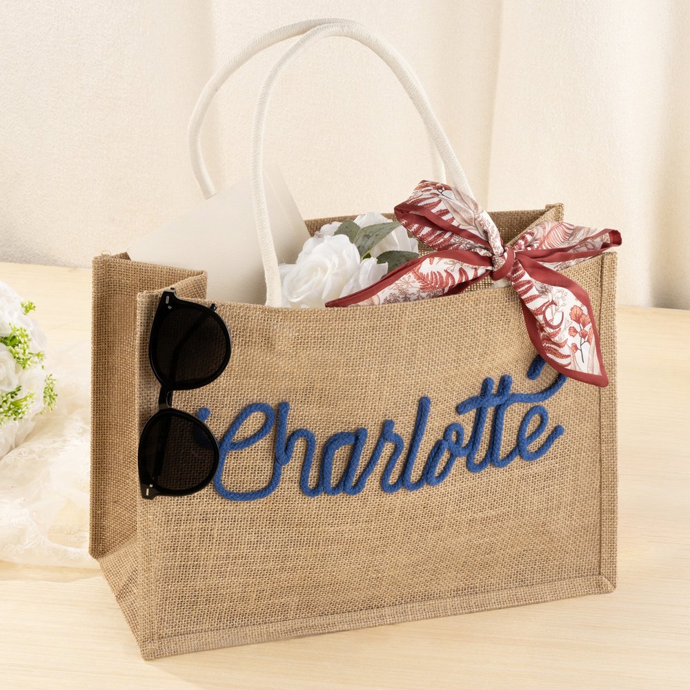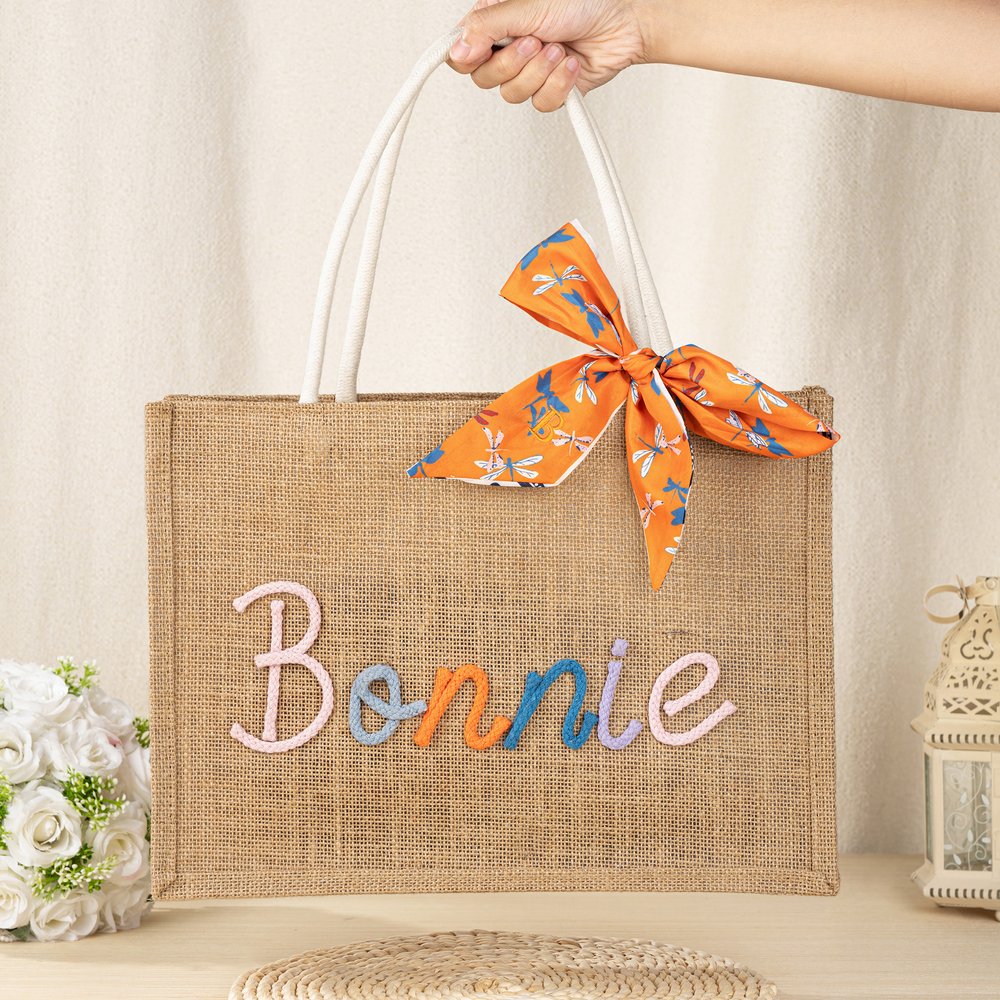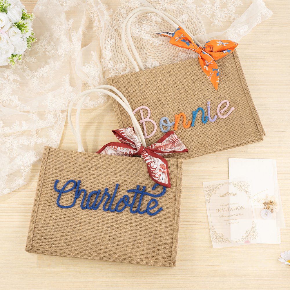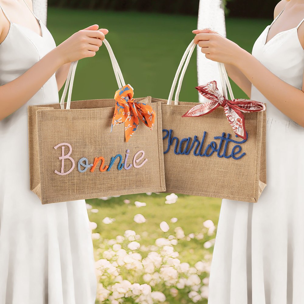 The jute-textured tote bag has a natural texture. You can customize your name on the bag. The ribbon is tied into a bow, and the ribbon styles include red leaves, dragonflies, etc. You can also embroider letters on the ribbon. The color matching is harmonious and full of detail, and the overall presentation is exquisite and warm.