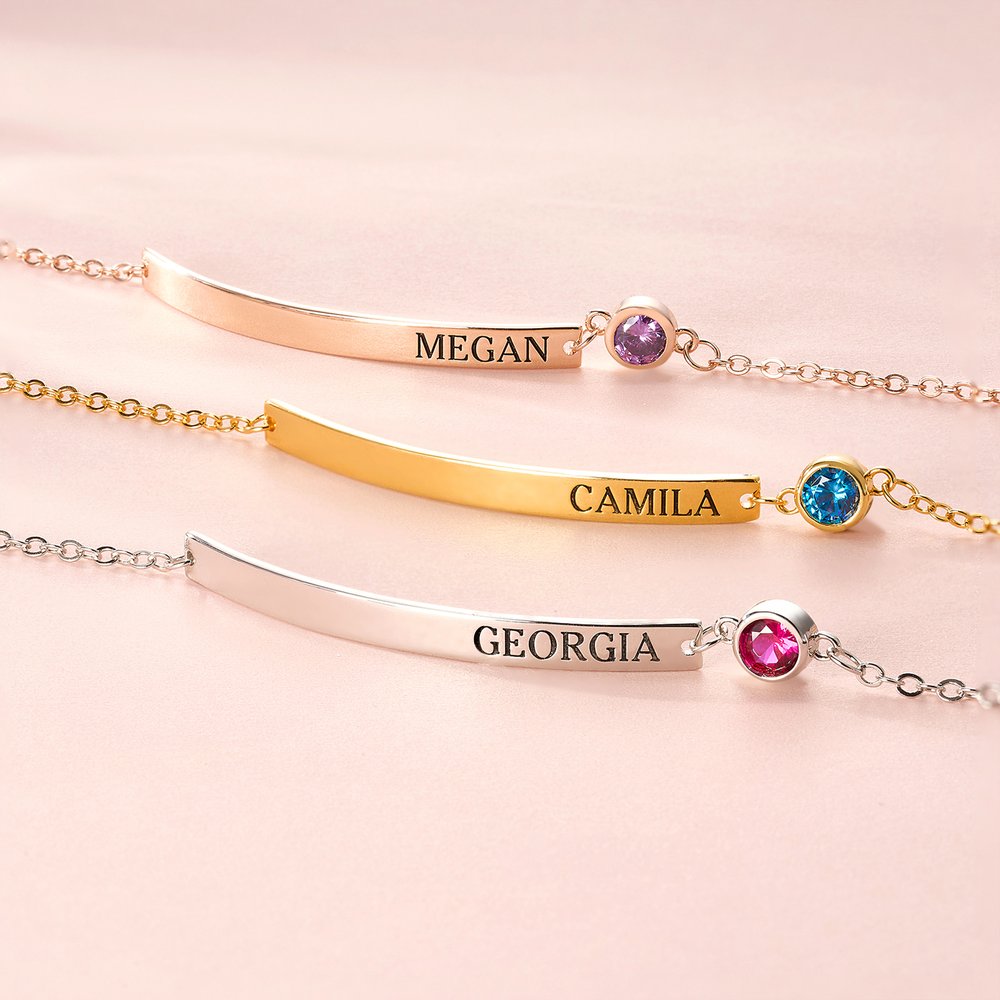 | Feature: | Metallic Luster, Smooth Surface, Bar Bracelet, with Birthstone, Name Customization |