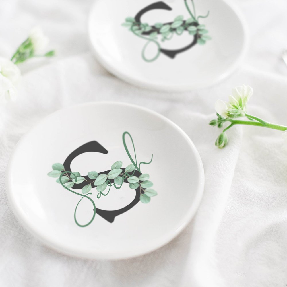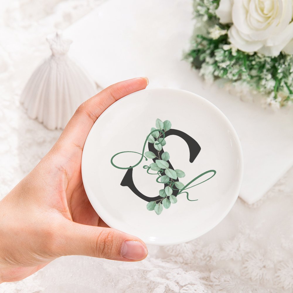 The ring trays are made of high-quality ceramic with a smooth surface and delicate edges. Their diameter is 4 inches, making them perfect for dressers, nightstands, or bathroom cabinets. Make them even more personal and unique by adding your name.