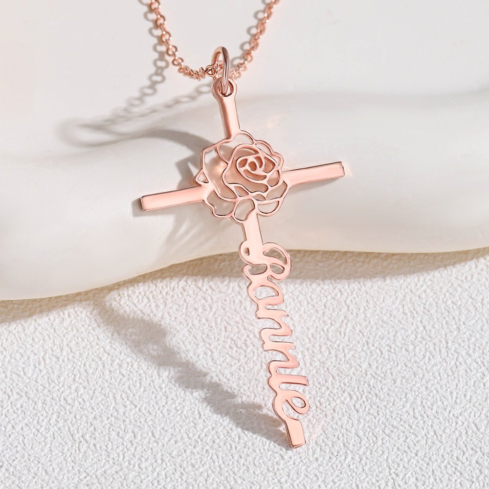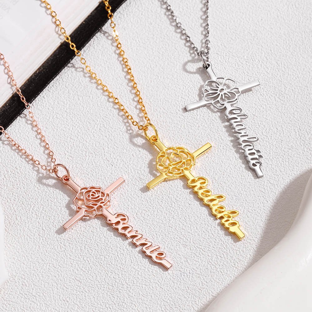 This exquisite necklace combines a classic cross with your Personalised name and hollow birth flower. It beautifully represents your faith while adding a personal touch, making it a meaningful accessory for everyday wear.