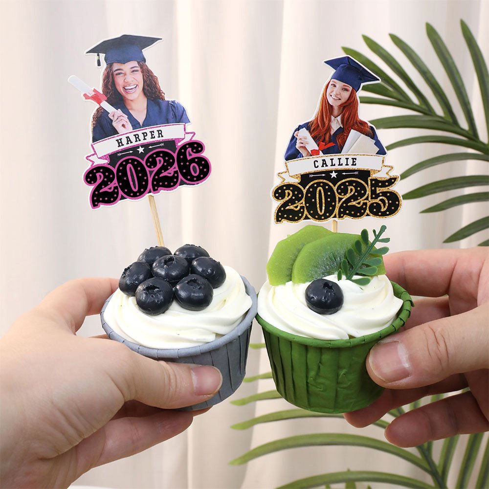 Elevate your graduation party treats with these amusing face photo cupcake toppers. Beyond featuring your photo, customize them with your name and graduation year, ensuring they're a unique addition to your celebration.